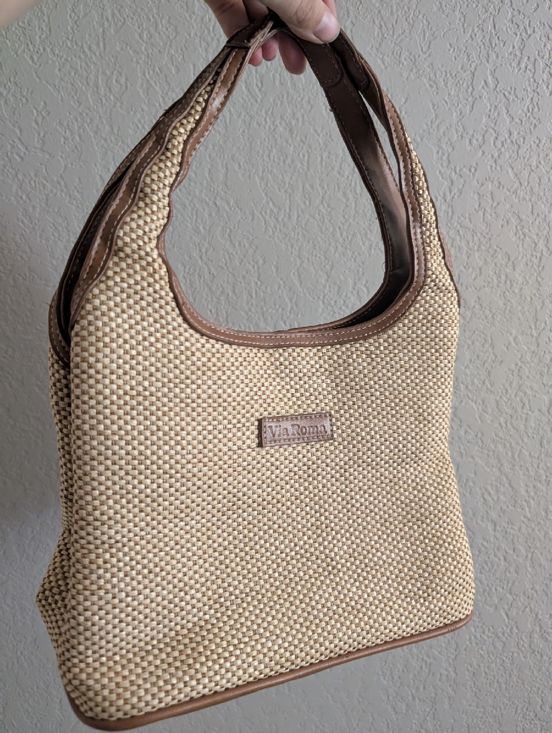 A cute Via Roma purse with a woven beige exterior and brown leather-look trim and handles. It has a magnetic closure and a zippered inside pocket. Perfect for everyday use!