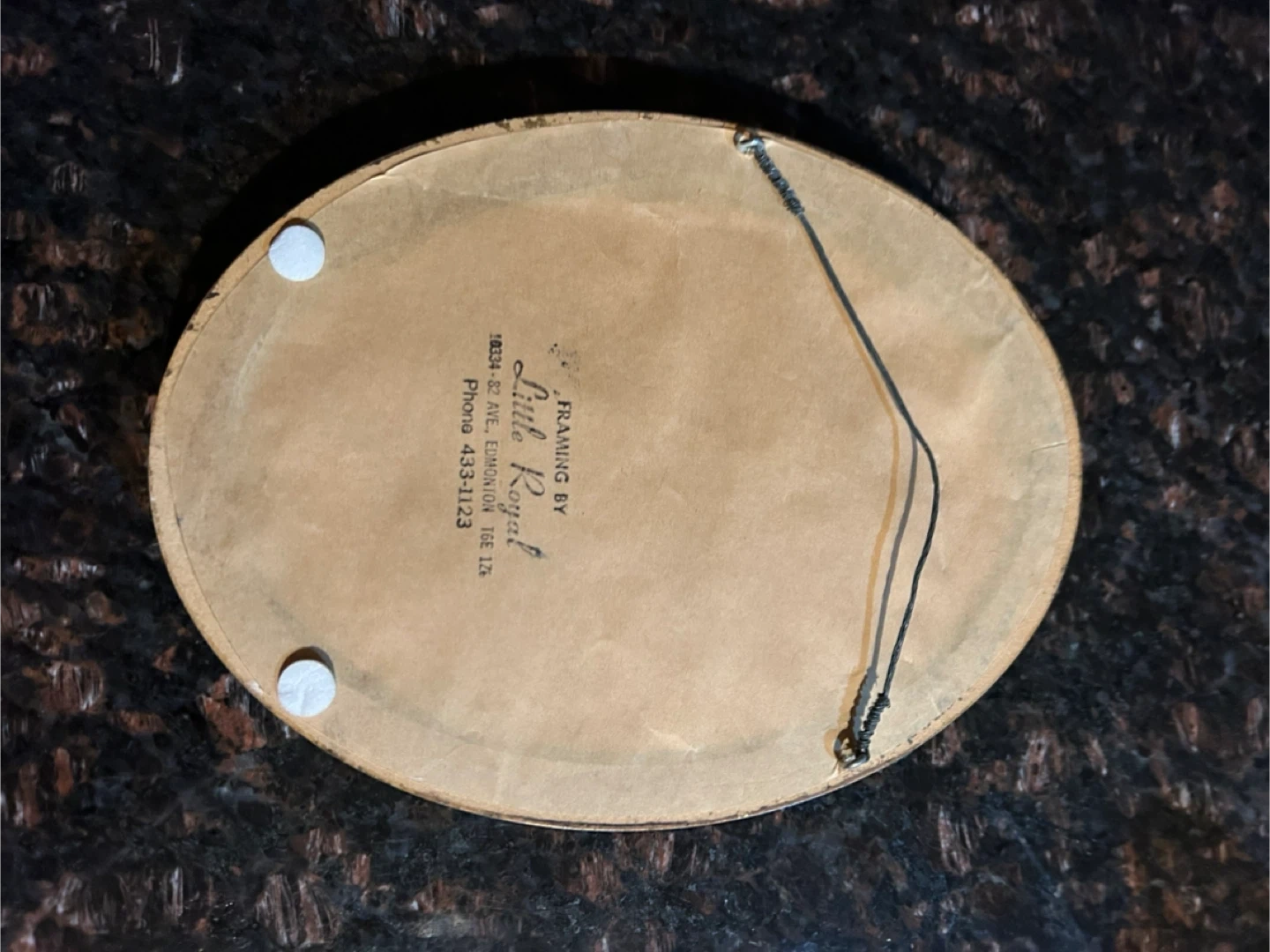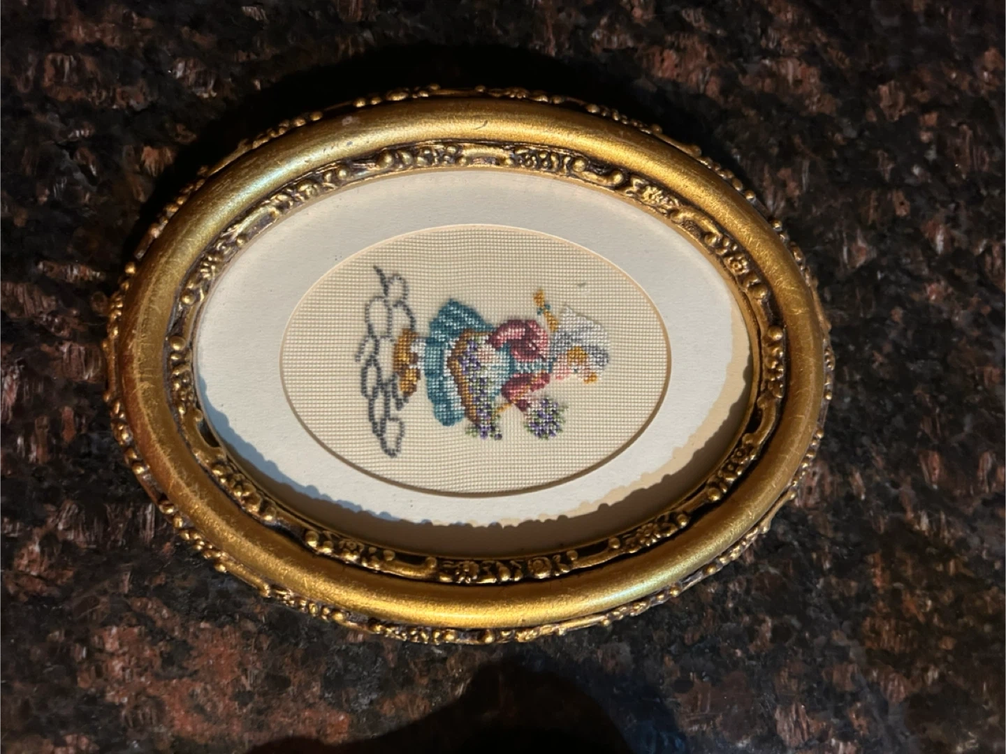 Selling a charming framed needlepoint art piece. It's framed by Little Royal, located in Edmonton. This piece would add a touch of vintage elegance to any room!