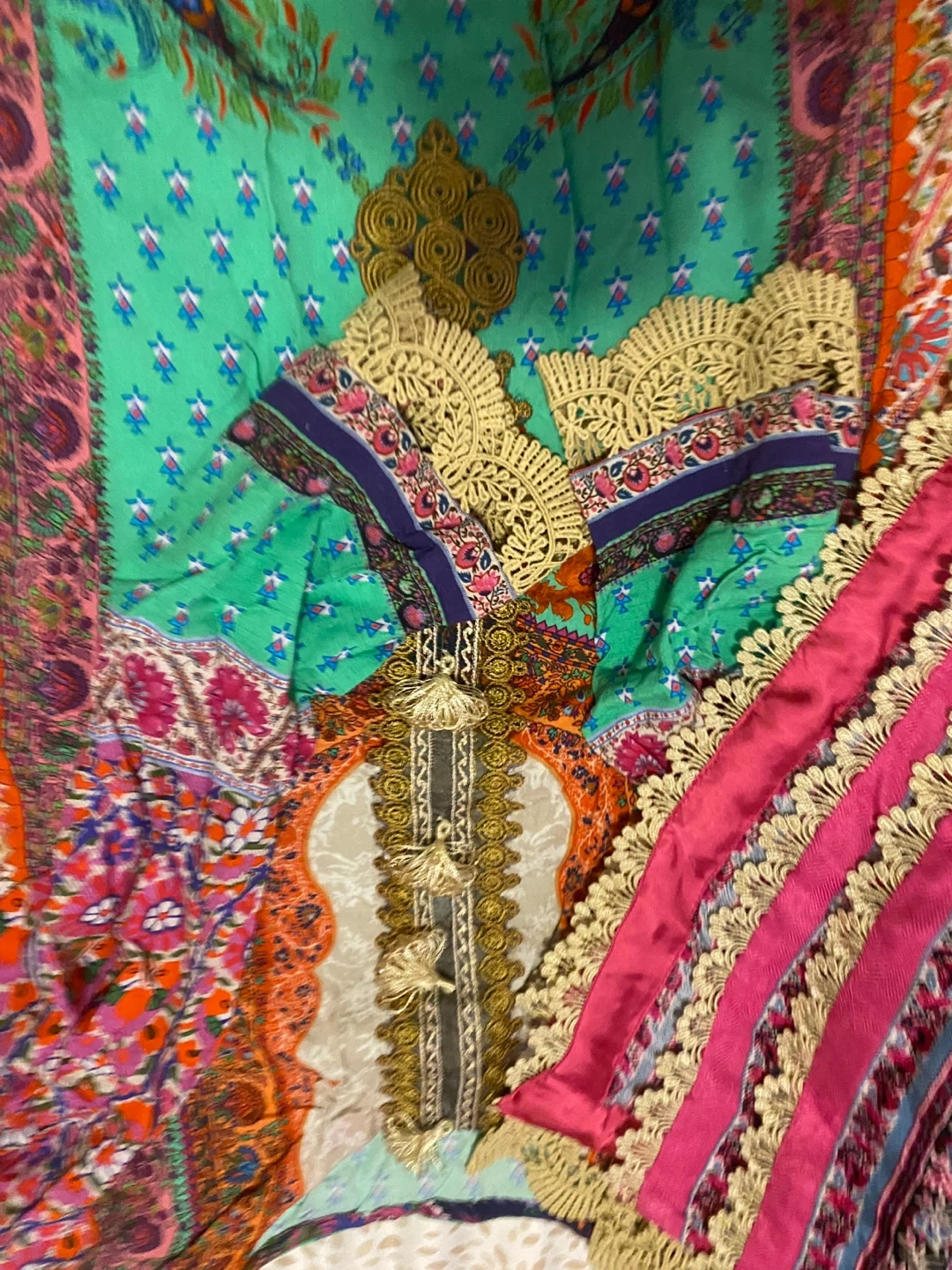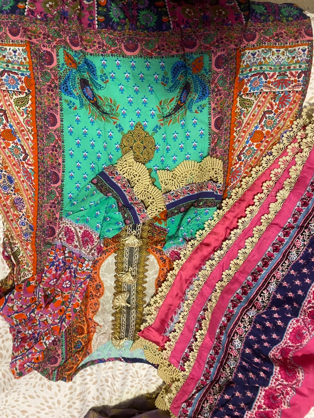 10This dress features a vibrant and colourful design with intricate patterns and gold detailing. The fabric is soft and comfortable, perfect for adding a splash of colour to your wardrobe. It's in great condition and ready for a new home