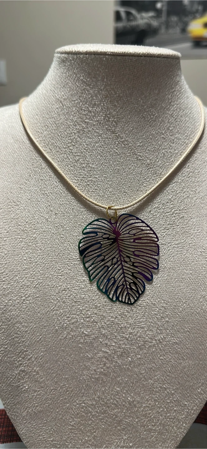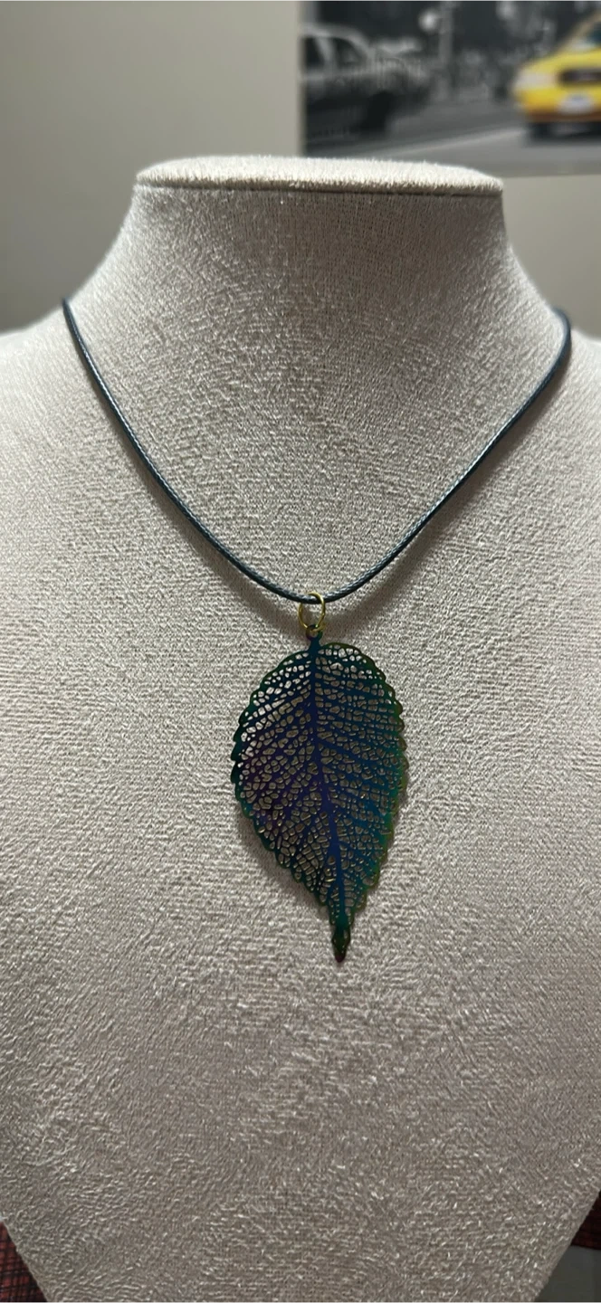 Selling these unique leaf pendant necklaces! They're perfect for adding a touch of nature to any outfit. The pendants have a beautiful iridescent finish that catches the light. Available in various leaf designs and cord colours.