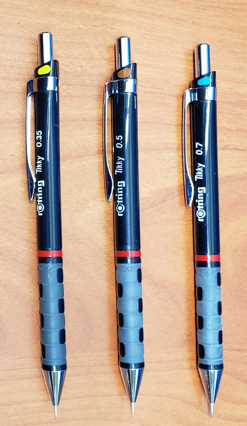 New Rotring Tikky mechanical pencil set includes 0.35mm, 0.5mm, and 0.7mm lead sizes. These pencils feature a comfortable grip and a smooth lead advance mechanism.