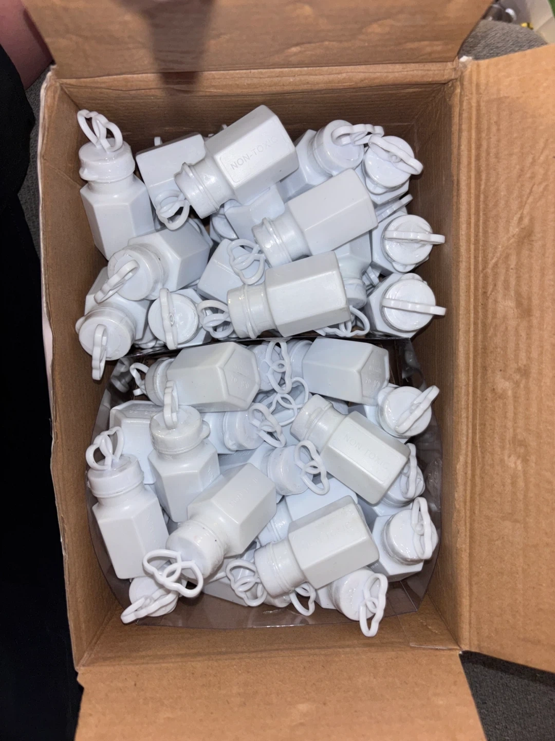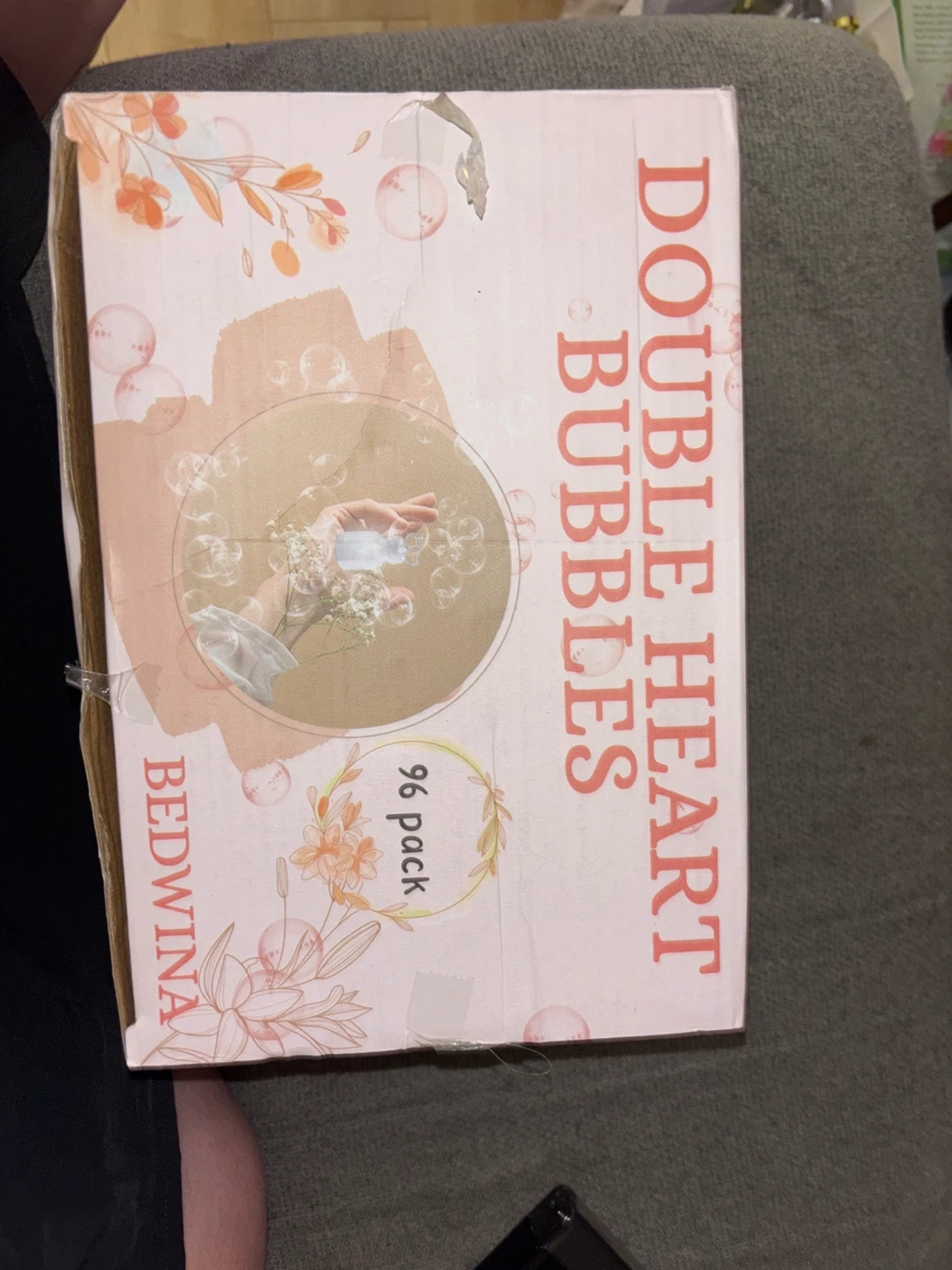15Selling a box of Bedwina Double Heart Bubbles! This is an ALMOST full 96 pack, perfect for parties, weddings, or just having some fun. The box is included and the bubbles are all white (and filled)