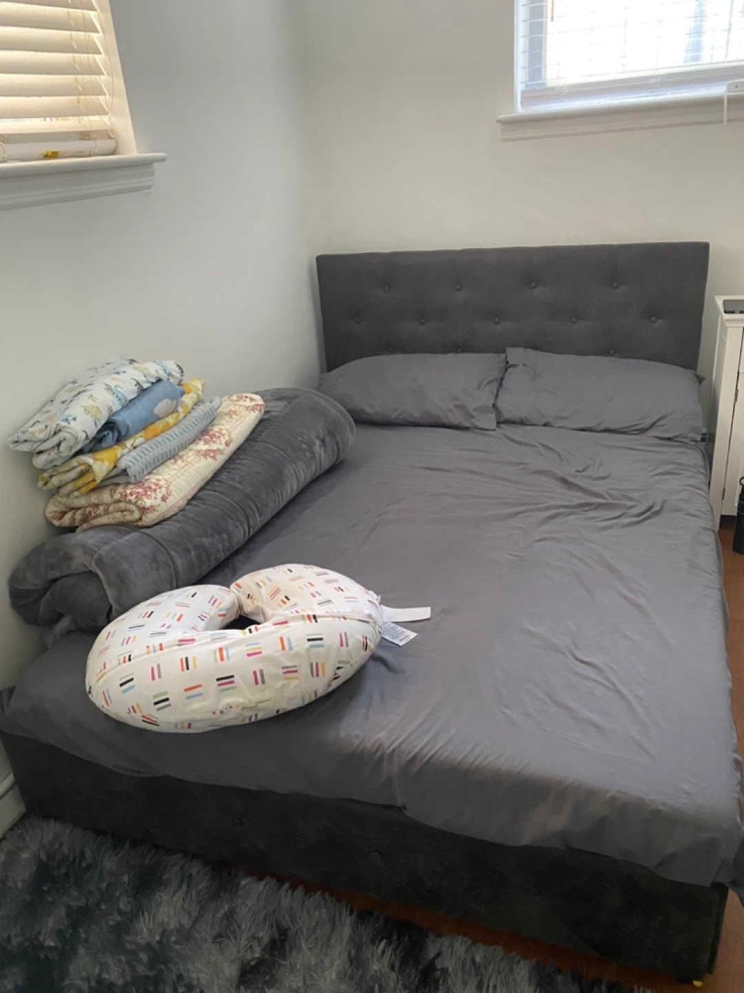 Selling a queen size bed frame in gray. It features a platform design and has built-in storage underneath. Perfect for maximizing space in your bedroom!