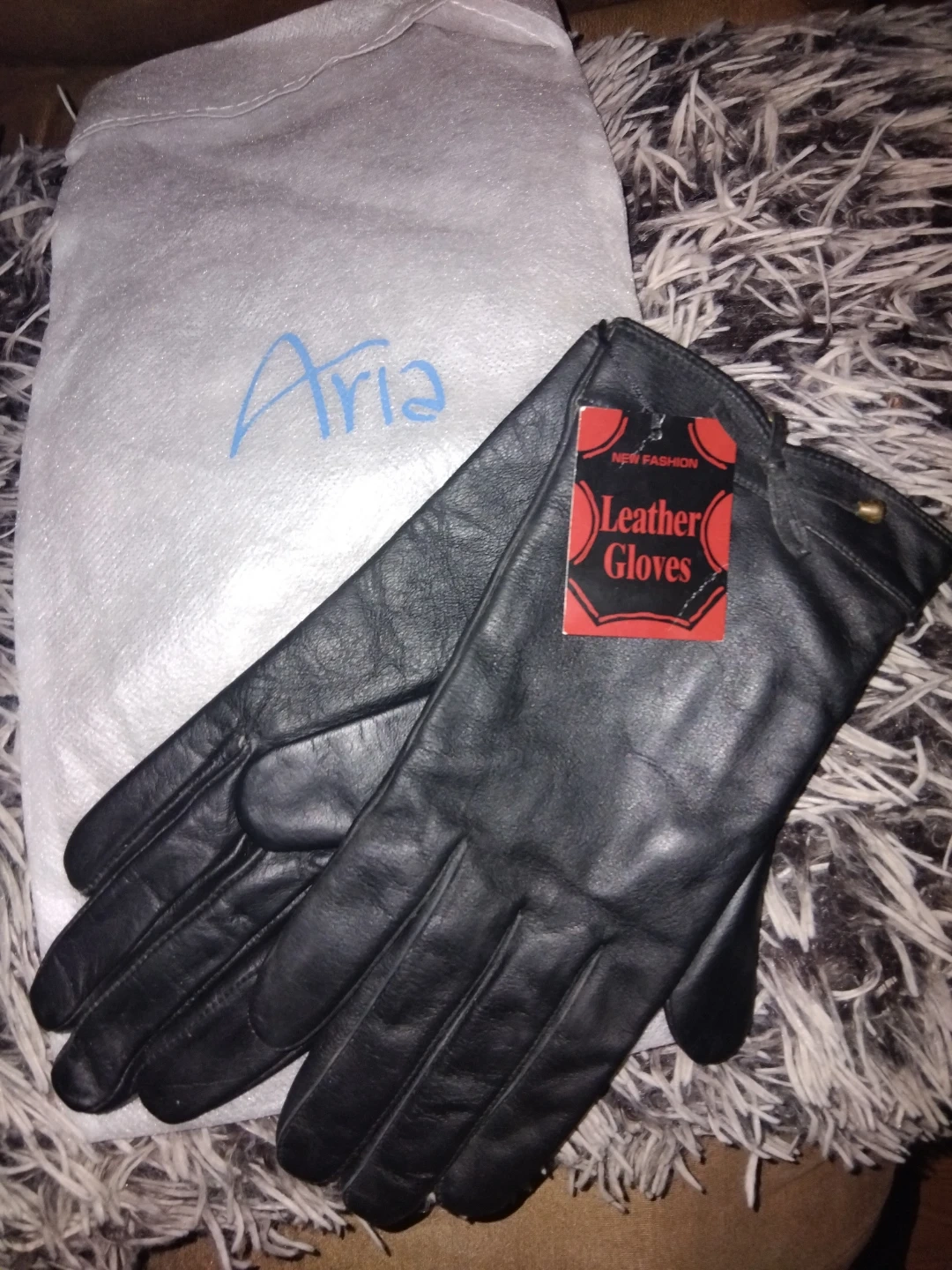 These are brand new black leather gloves from Aria. They are made from genuine leather. Keep your hands warm this winter!