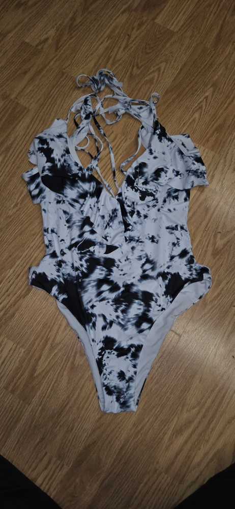 This stylish one-piece swimsuit features a trendy tie-dye pattern in black and white. It has ruffled details on the sleeves and a flattering cut. Adjustable ties at the neck and back ensure a secure fit. Never worn because I couldn't figure out the strings so apologies for the pics.