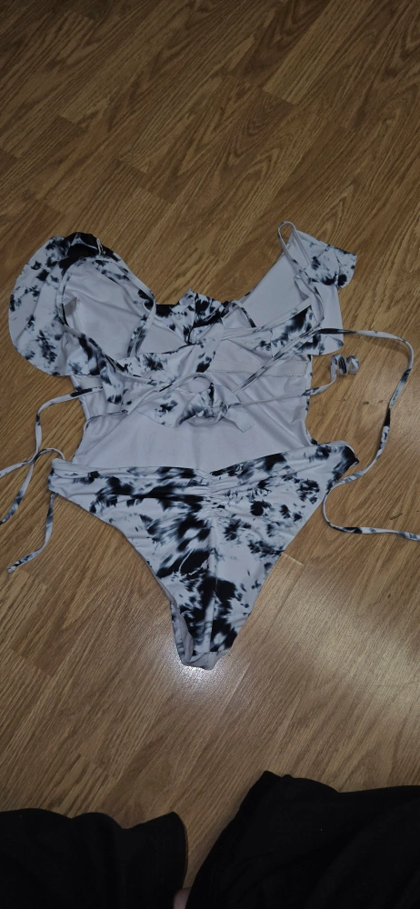 This stylish one-piece swimsuit features a trendy tie-dye pattern in black and white. It has ruffled details on the sleeves and a flattering cut. Adjustable ties at the neck and back ensure a secure fit. Never worn because I couldn't figure out the strings so apologies for the pics.