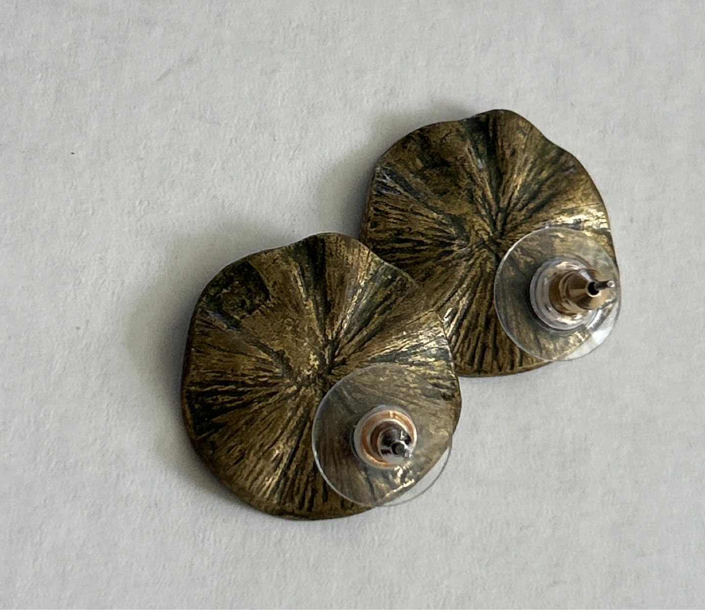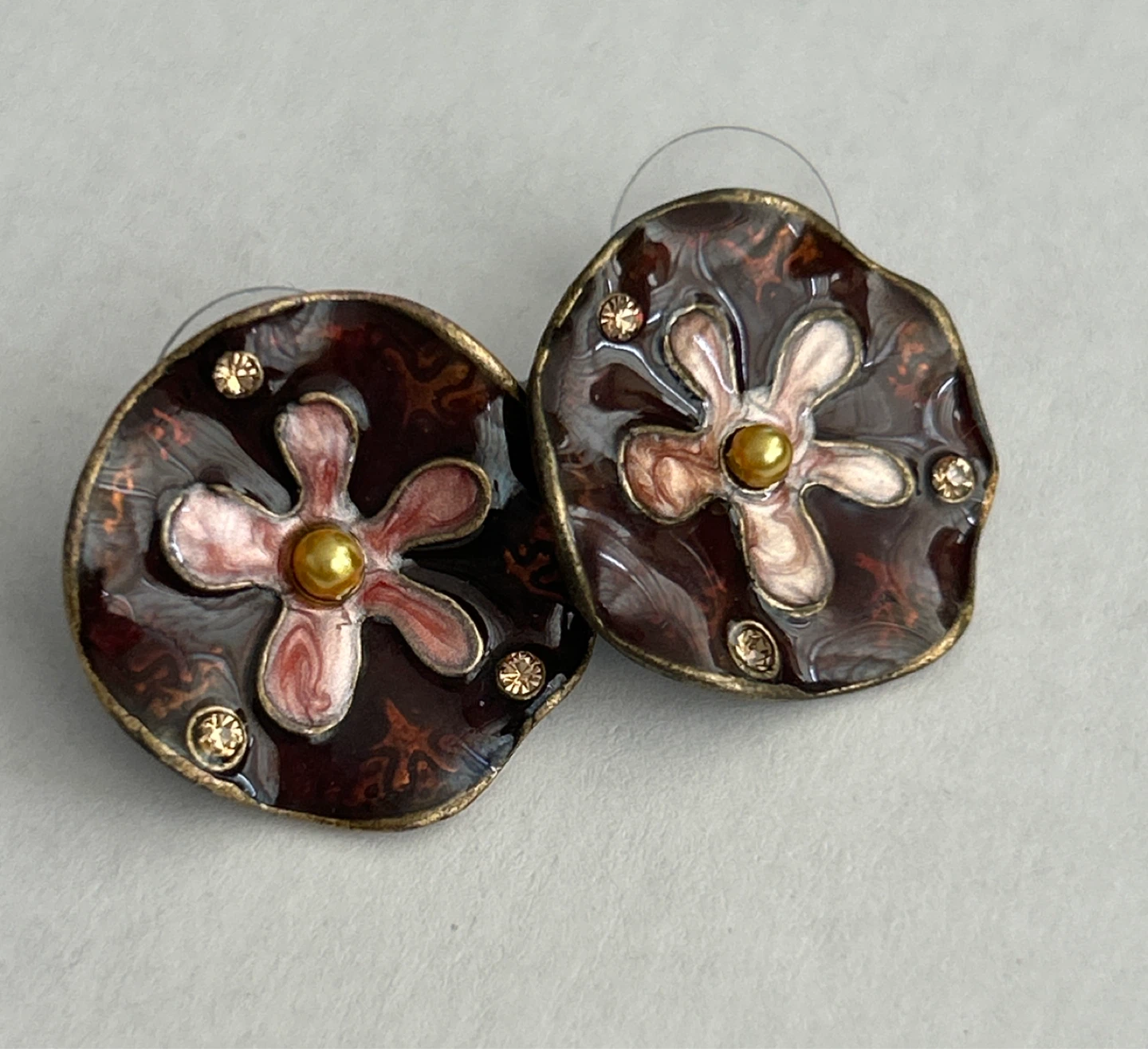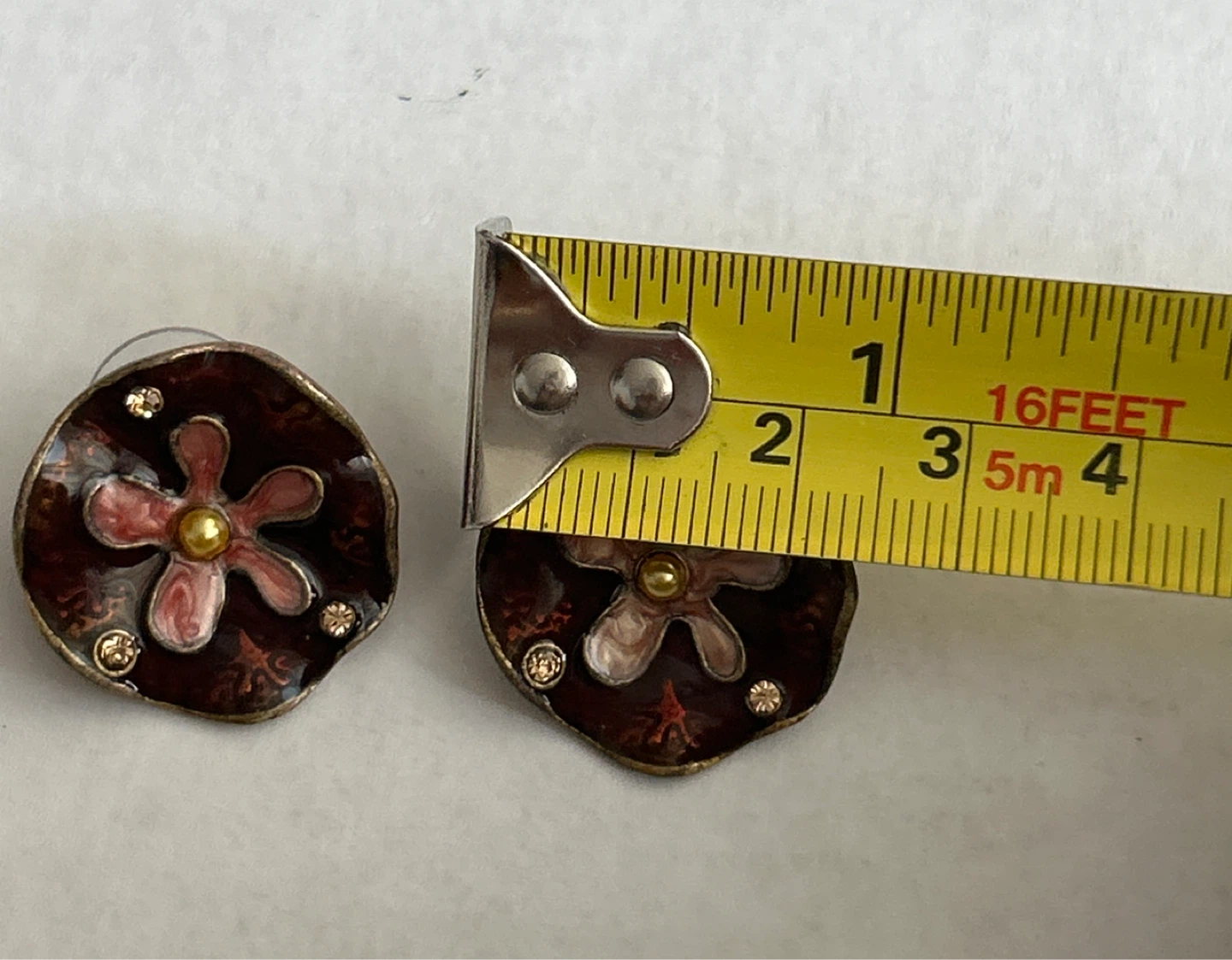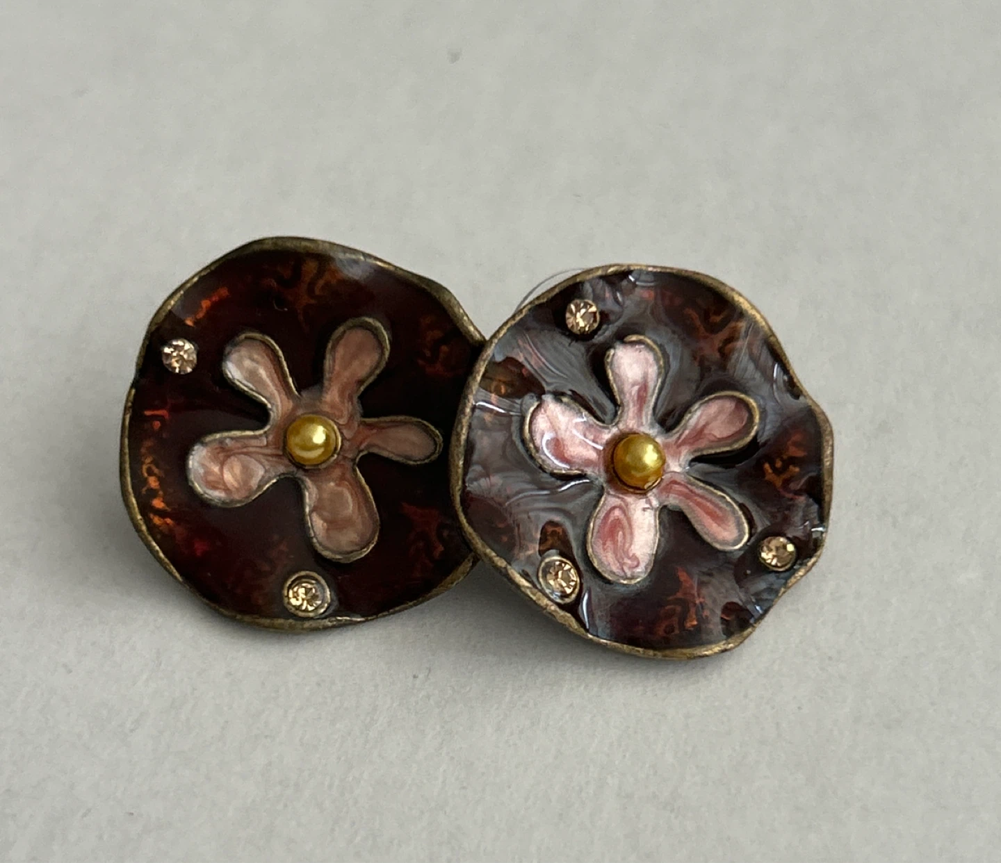These earrings feature a unique flower design in shades of brown and pink. They are in great condition and measure approximately 1 inch in diameter. Perfect for adding a touch of floral elegance to any outfit!