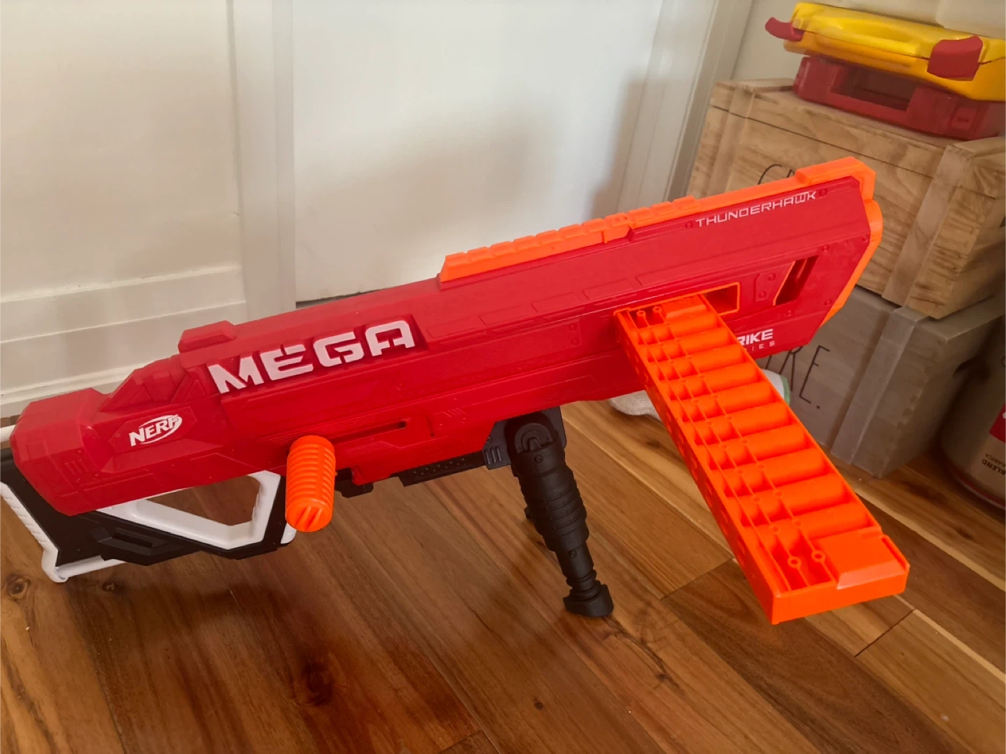 Selling a Nerf Mega Thunderhawk blaster in great condition! It's red and orange, and ready for some serious fun. Comes with a stand and the mega darts!