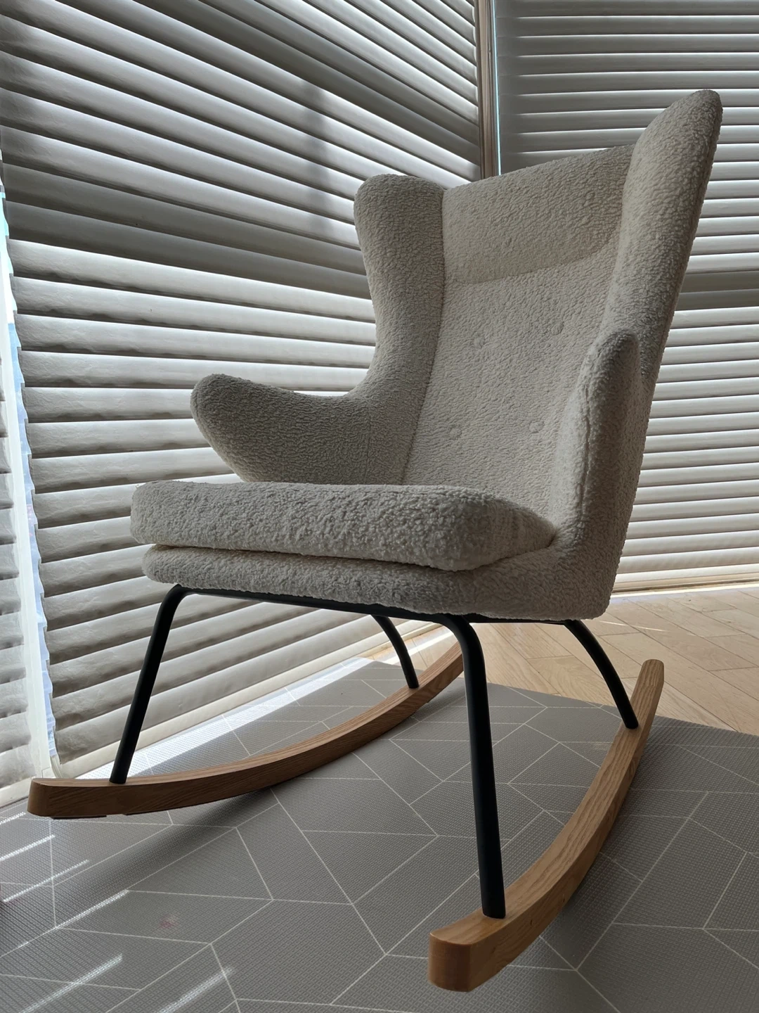 I'm selling a lovely rocking chair in a cream colour. It's in excellent condition and it’s perfect for a nursery or living room.