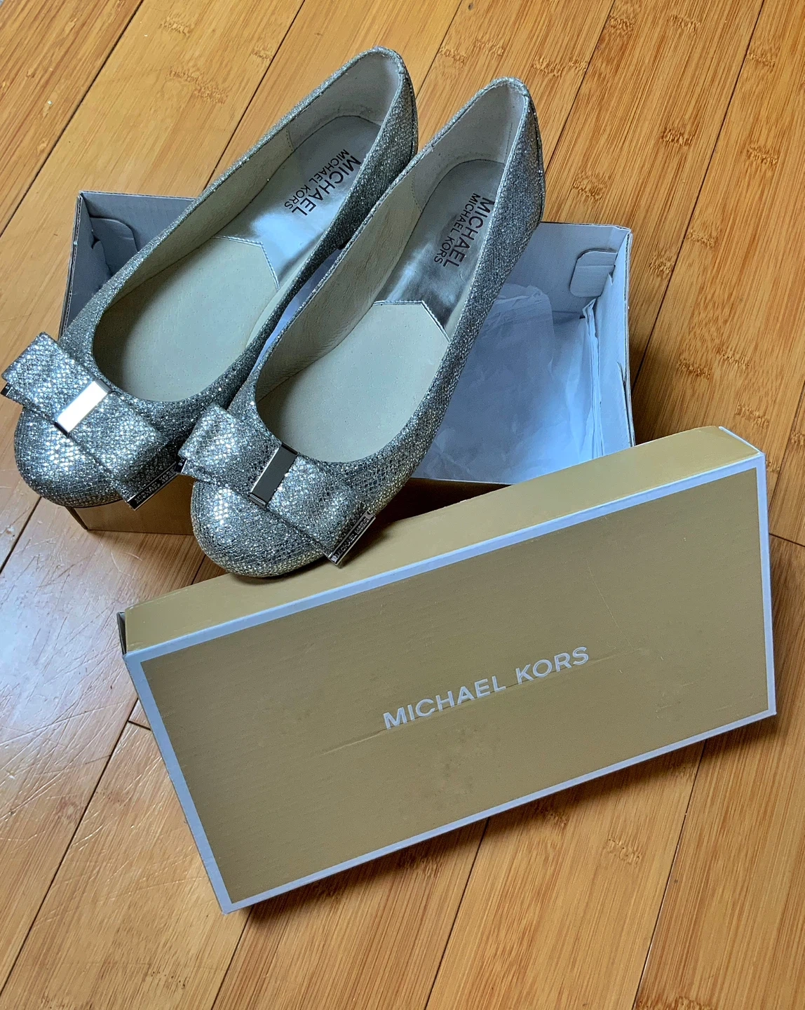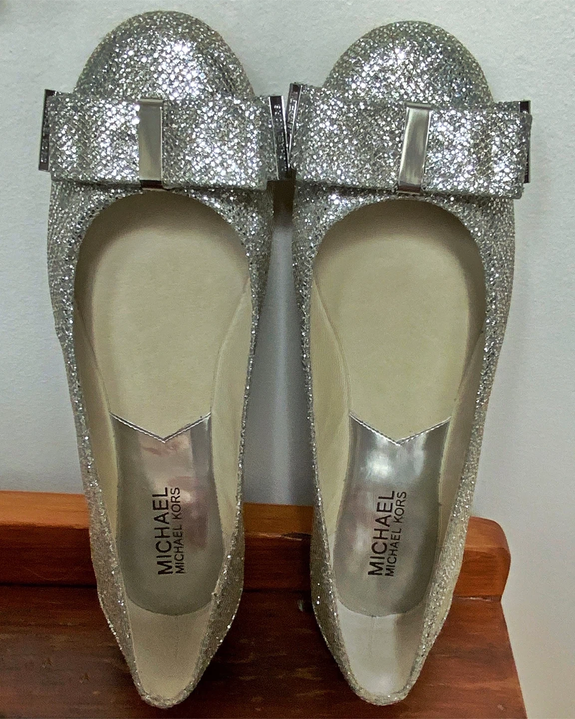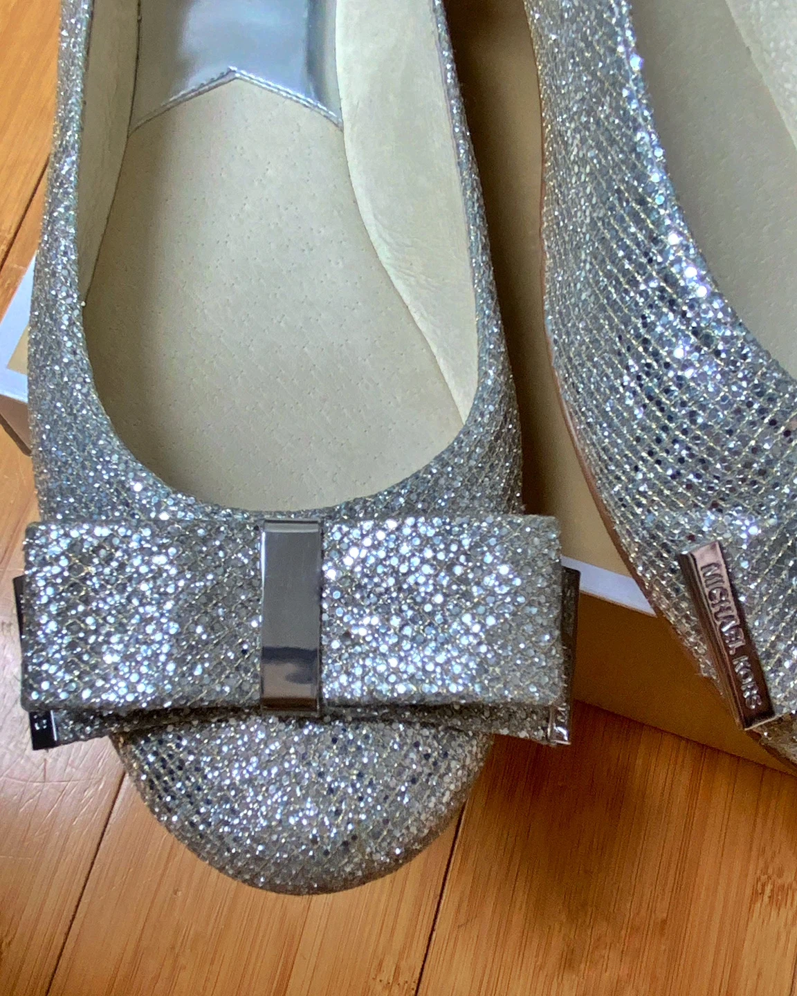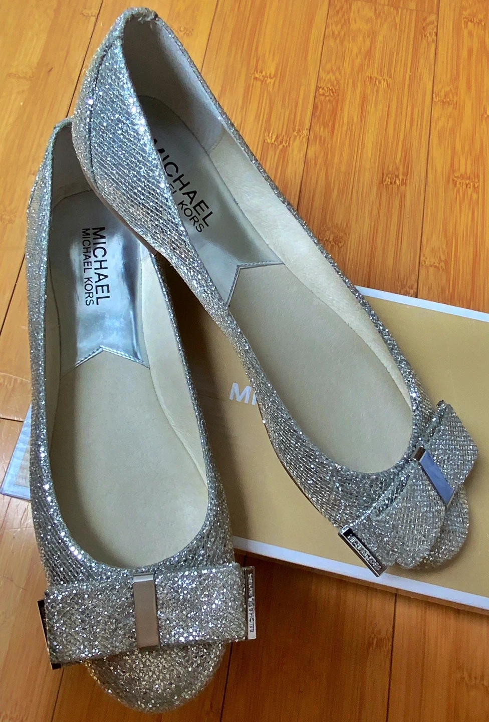 BRAND NEW /NEVER WORN MICHAEL KORS SILVER GLITTER BALLET FLATS WITH BOWS