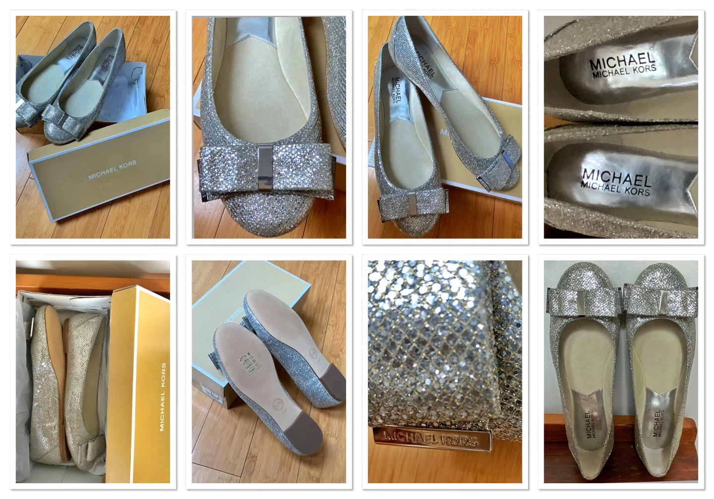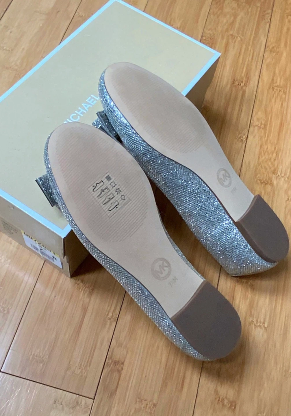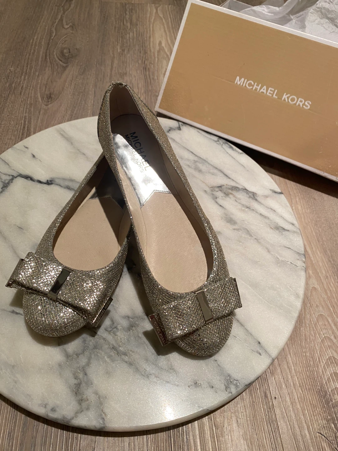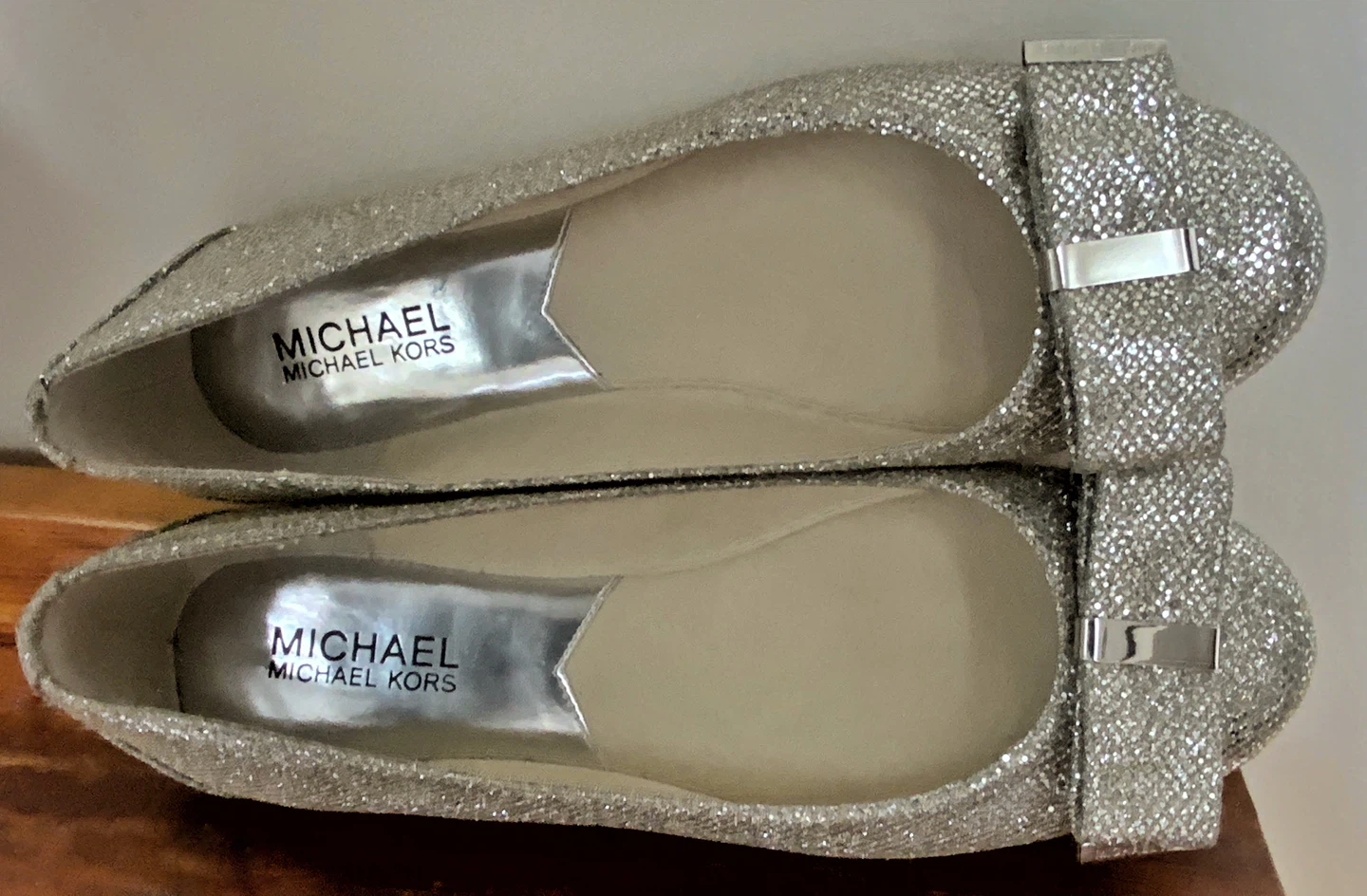 BRAND NEW /NEVER WORN MICHAEL KORS SILVER GLITTER BALLET FLATS WITH BOWS