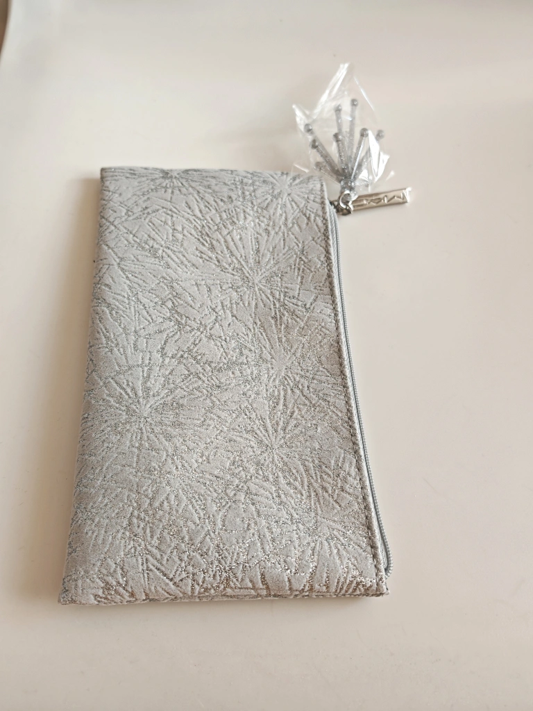 Selling a brand new silver MAC pouch. It has a lovely textured design and comes with a sparkly brooch to add some extra flair. Perfect for makeup or small accessories!