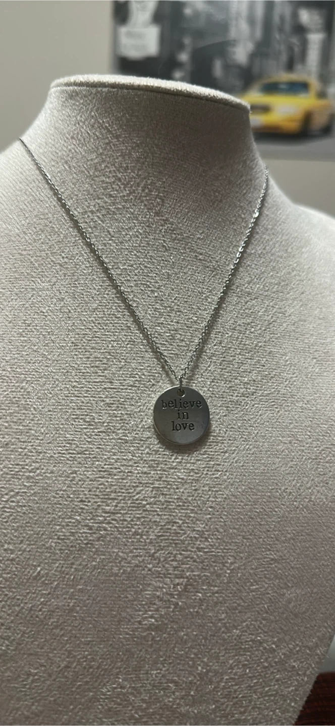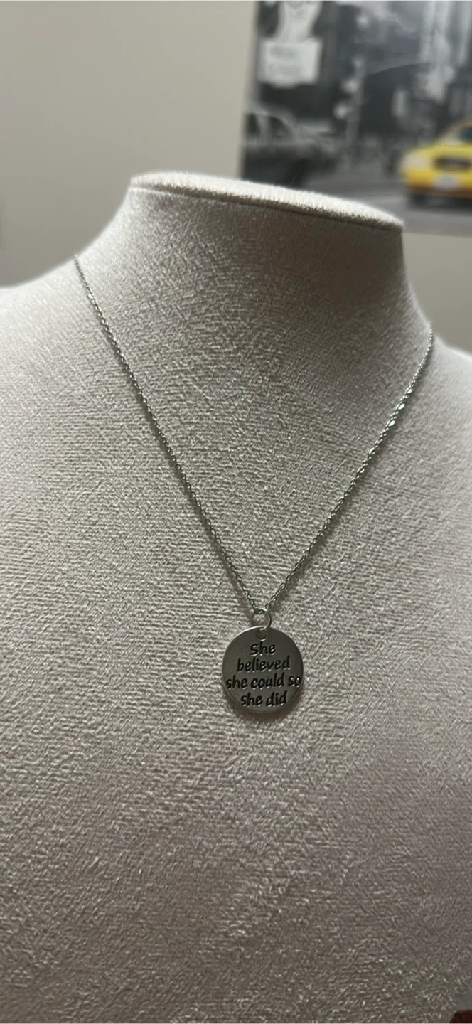 Selling a collection of silver tone necklaces, each with a unique inspirational pendant. The pendants feature different engravings such as 'She believed she could so she did', 'Live your dream', 'Believe in love', and others with various inspirational messages. These necklaces are perfect for adding a touch of inspiration to your everyday style