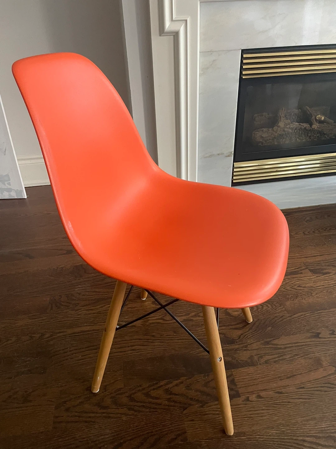 Selling an orange Eames-style chair. This chair is a vibrant addition to any room. Its iconic design and comfortable seat make it a stylish and functional piece of furniture