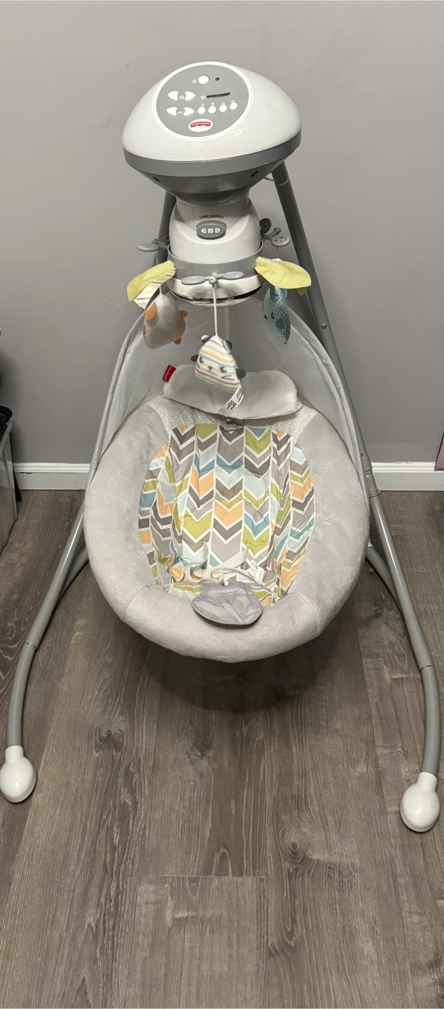 100Gently used Fisher-Price baby swing in good condition. It features a comfortable seat with a cute chevron pattern and hanging toys to keep your little one entertained. Perfect for soothing and relaxing your baby!