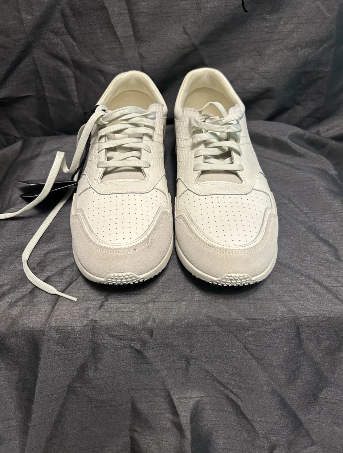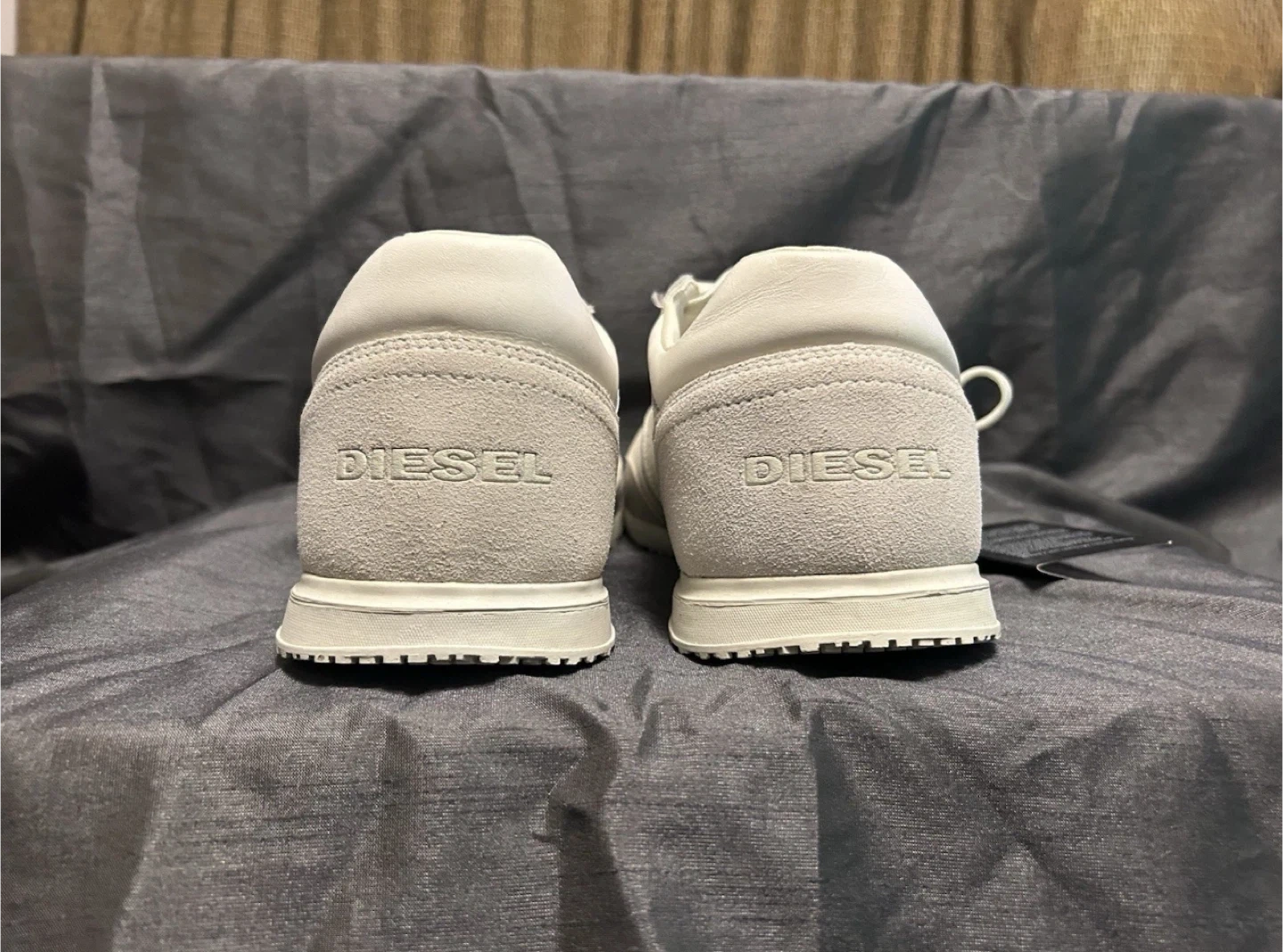 21Selling a pair of Diesel sneakers in white leather. These are in great condition and ready for a new home! The design features a mix of textures, including a perforated leather upper and suede detailing. The Diesel logo is embossed on the heel. They're a stylish and comfortable choice for everyday wear