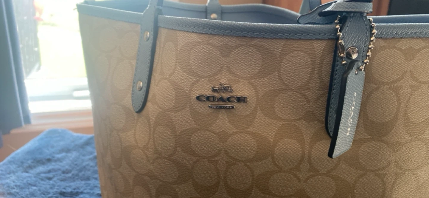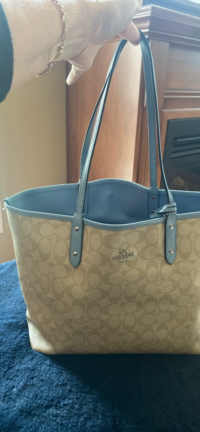 Selling a Coach Reversible City Tote in the signature jacquard pattern! It's in great condition and features a light blue interior. Includes a matching Coach pouch with the style number C1747-F36658