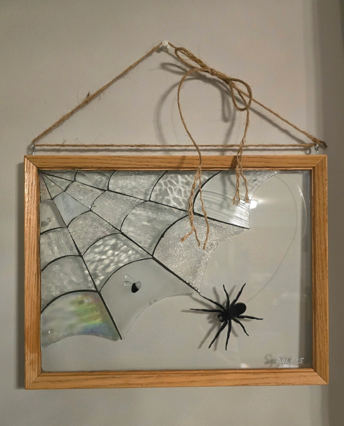 Check out this unique handcrafted spiderweb stained glass art! It features a detailed spiderweb with a glass black spider, fused glass dew drops and fly in the web. Perfect for adding a spooky touch to your home decor for Halloween or year-round.