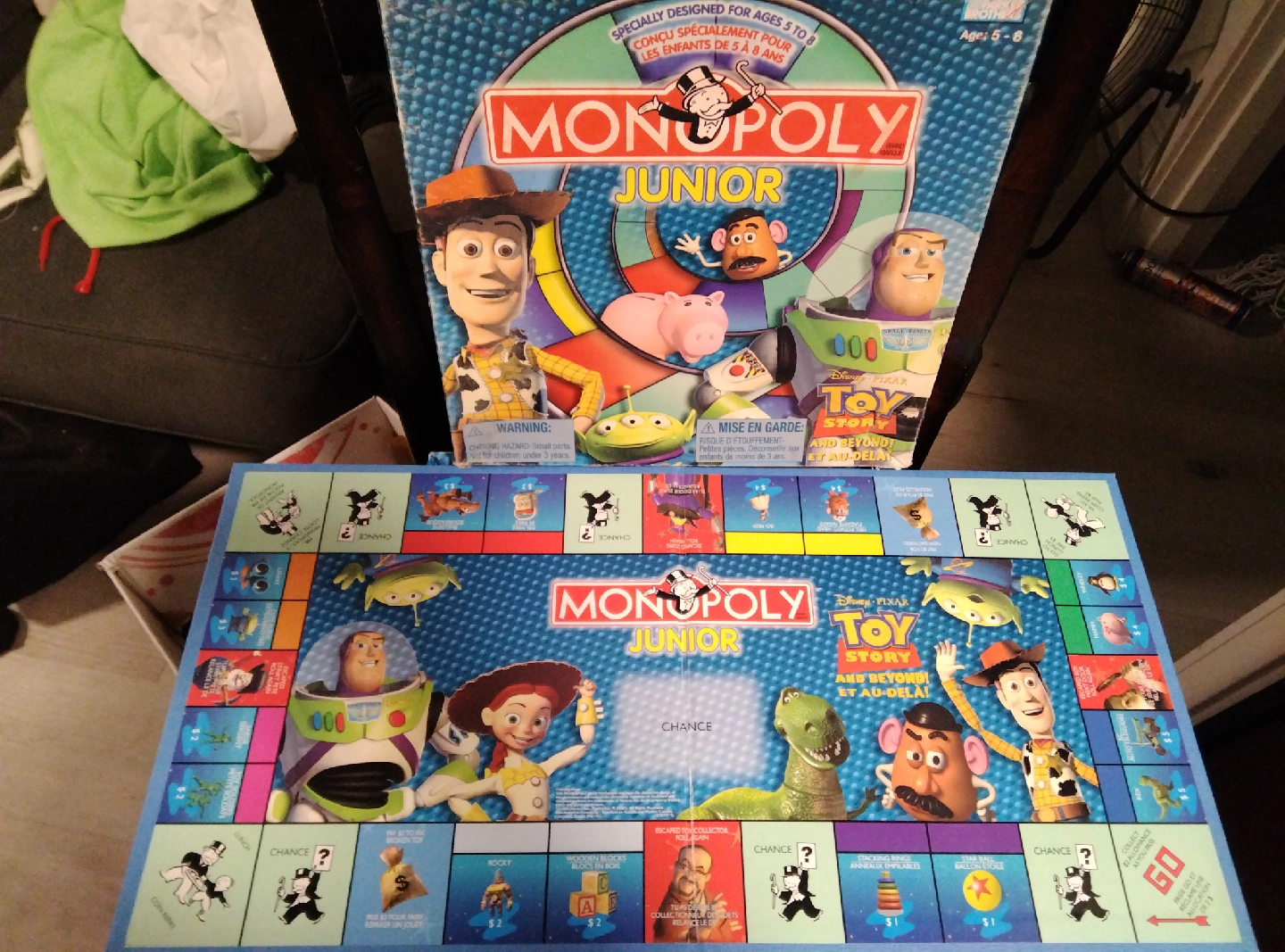 Selling a Monopoly Junior game with a Toy Story theme! It's designed for ages 5-8. The box and the board are included. It's a fun way to introduce kids to the classic game of Monopoly, featuring their favourite Toy Story characters