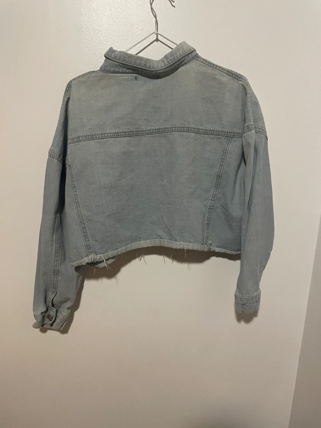 Selling a light wash denim jacket from PrettyLittleThing. It's a cropped style with a raw hem. Great for layering!