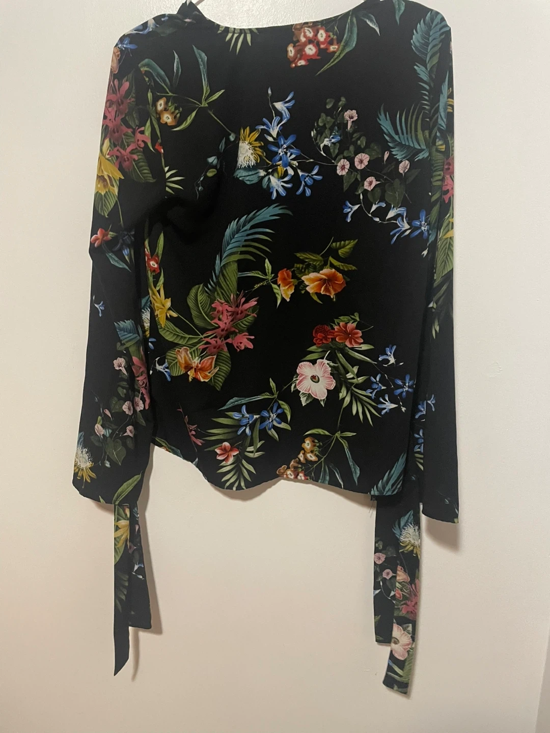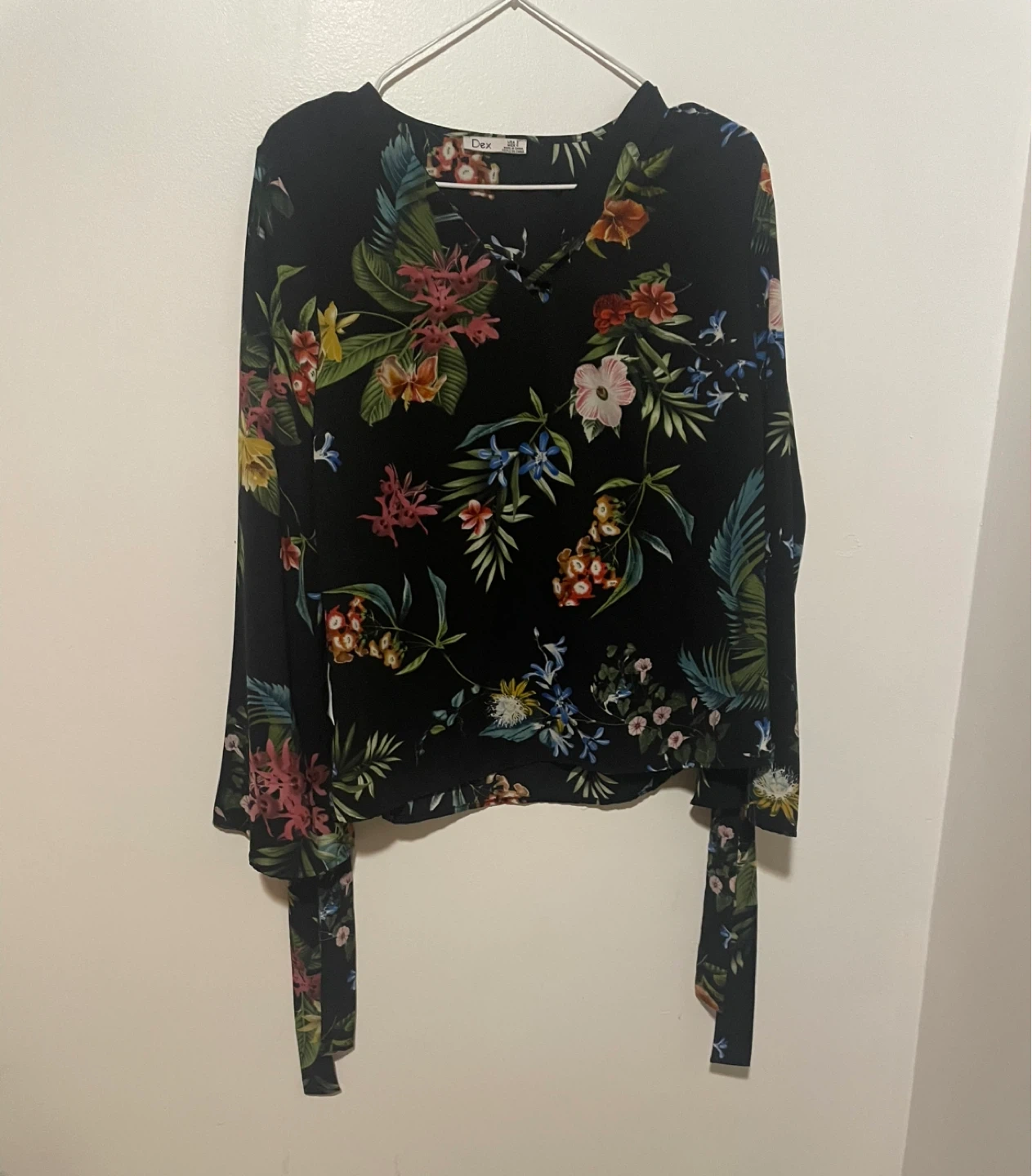 Selling a beautiful black floral blouse from Daze in size medium. It's in great condition and features a vibrant floral pattern that would look great for any occasion!