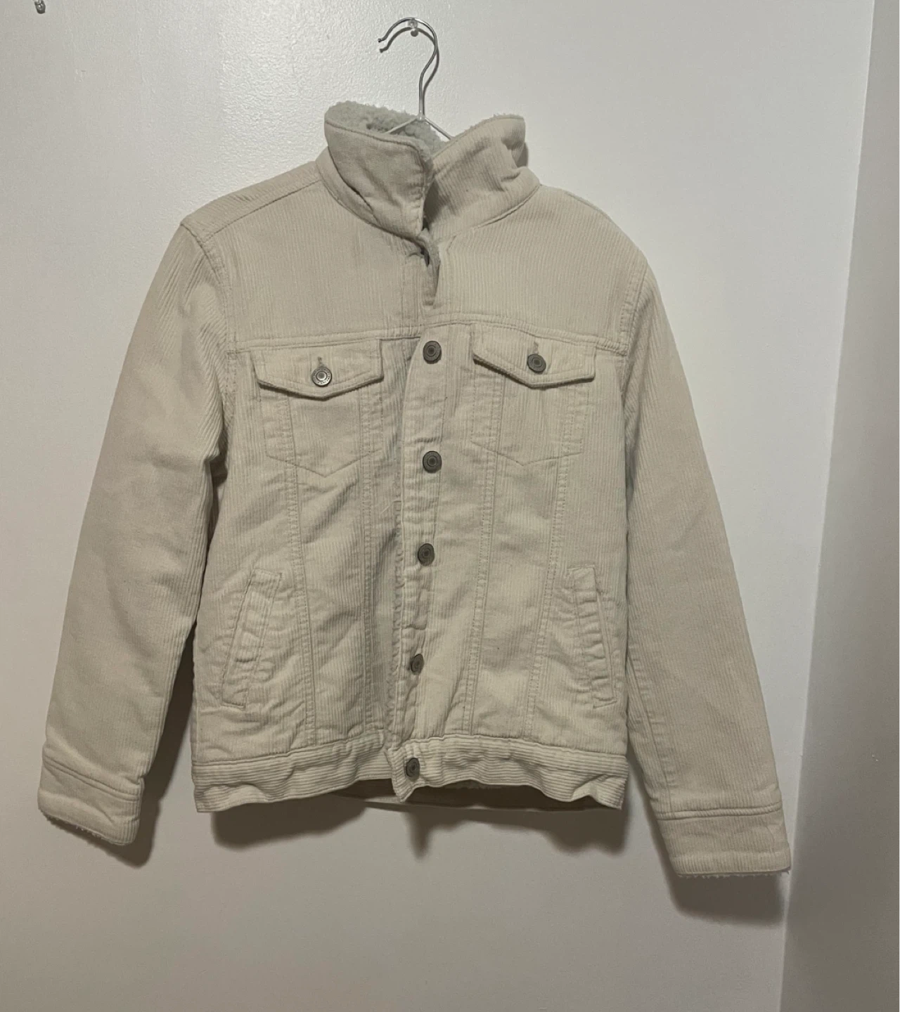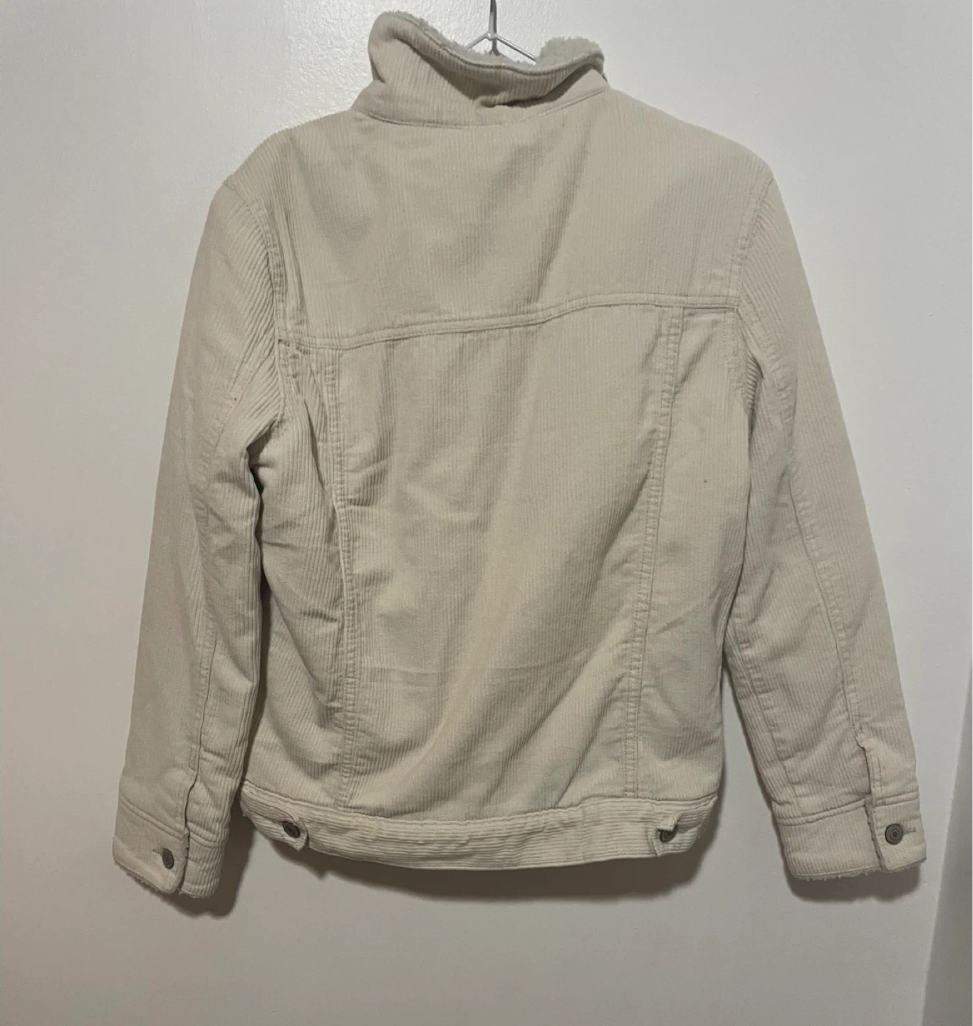This is a Garage corduroy jacket in a cream colour. It's in great condition and ready for a new home! The material is corduroy, making it a stylish and comfortable choice for cooler weather