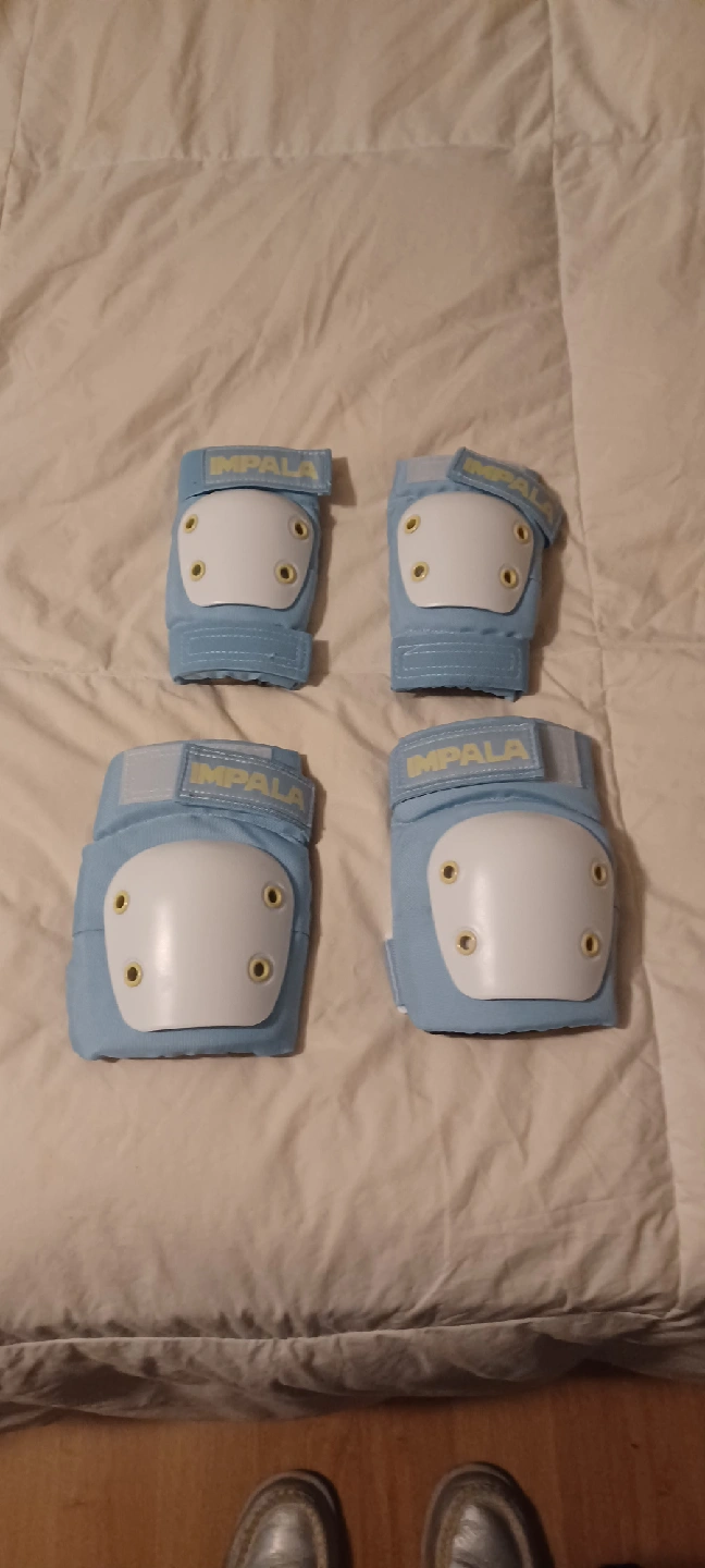 Get ready to roll with this Impala protective set! Includes knee and elbow pads in a light blue colour. Perfect for skating, rollerblading, or any other activity where you need a little extra protection. Comes in a mesh carrying bag for easy storage and transport. Worn once, ended up being too small. Recommended for kids.