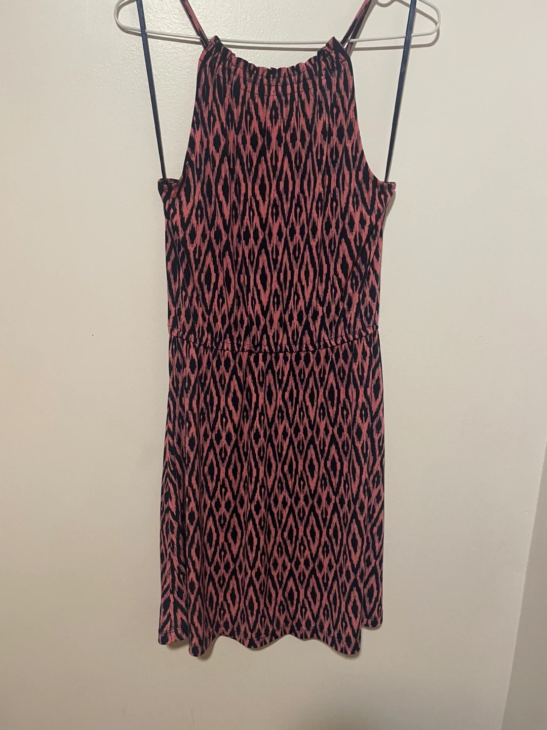 Cute sundress with a unique pattern! It features a halter neckline and a comfortable elastic waist. Perfect for summer days