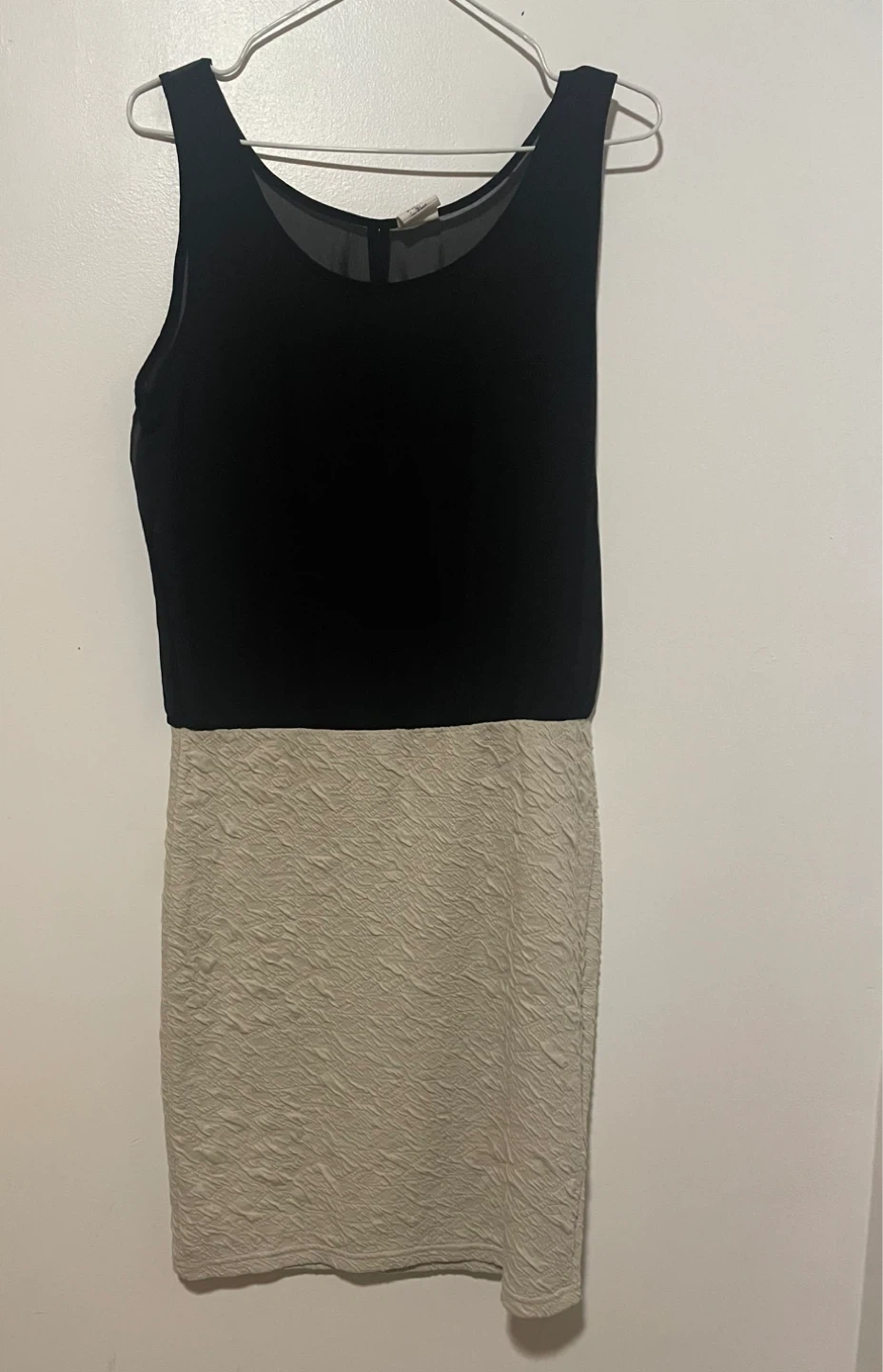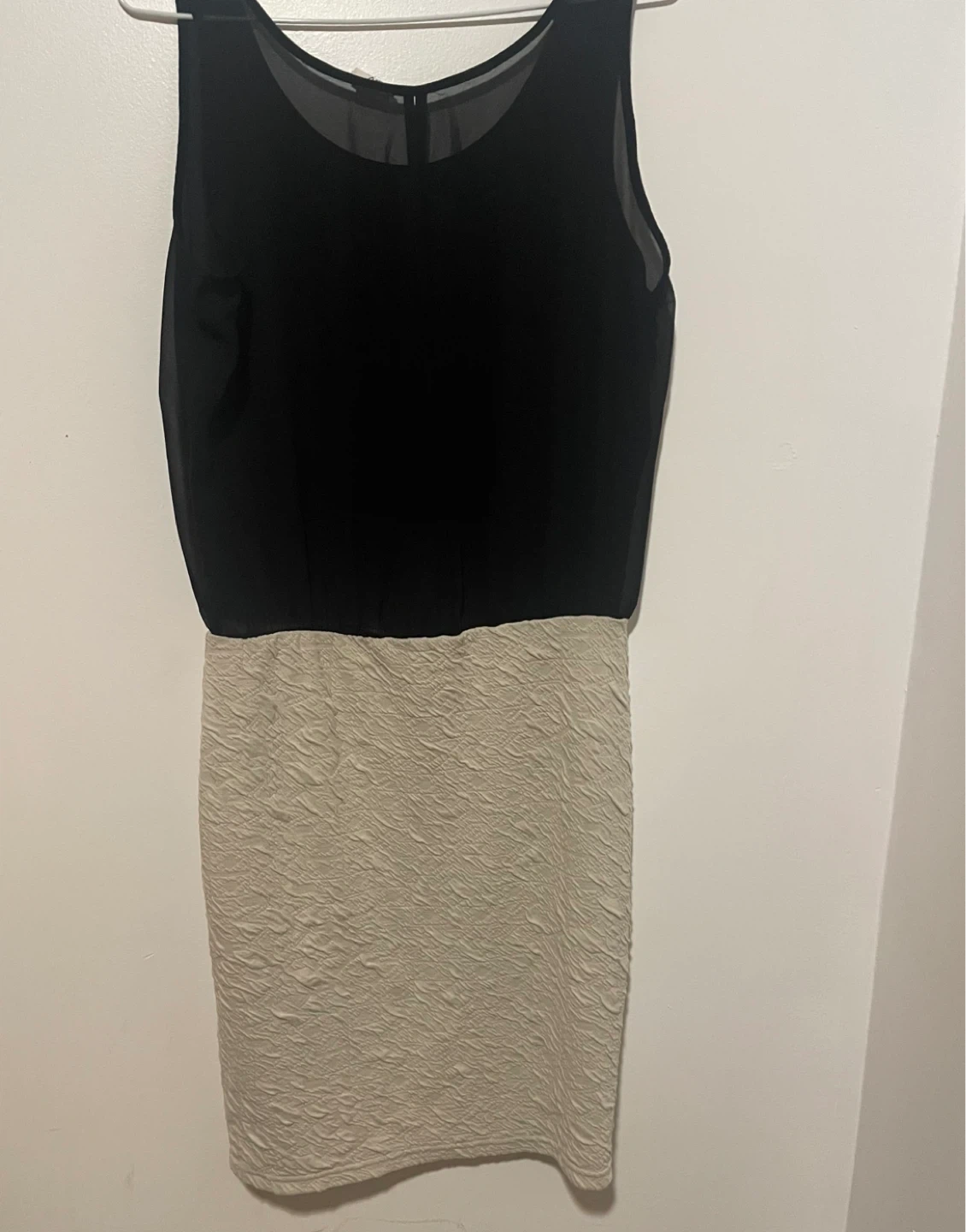 A stylish dress featuring a black top and a cream-coloured textured bottom. It's in great condition and ready for a new home!
