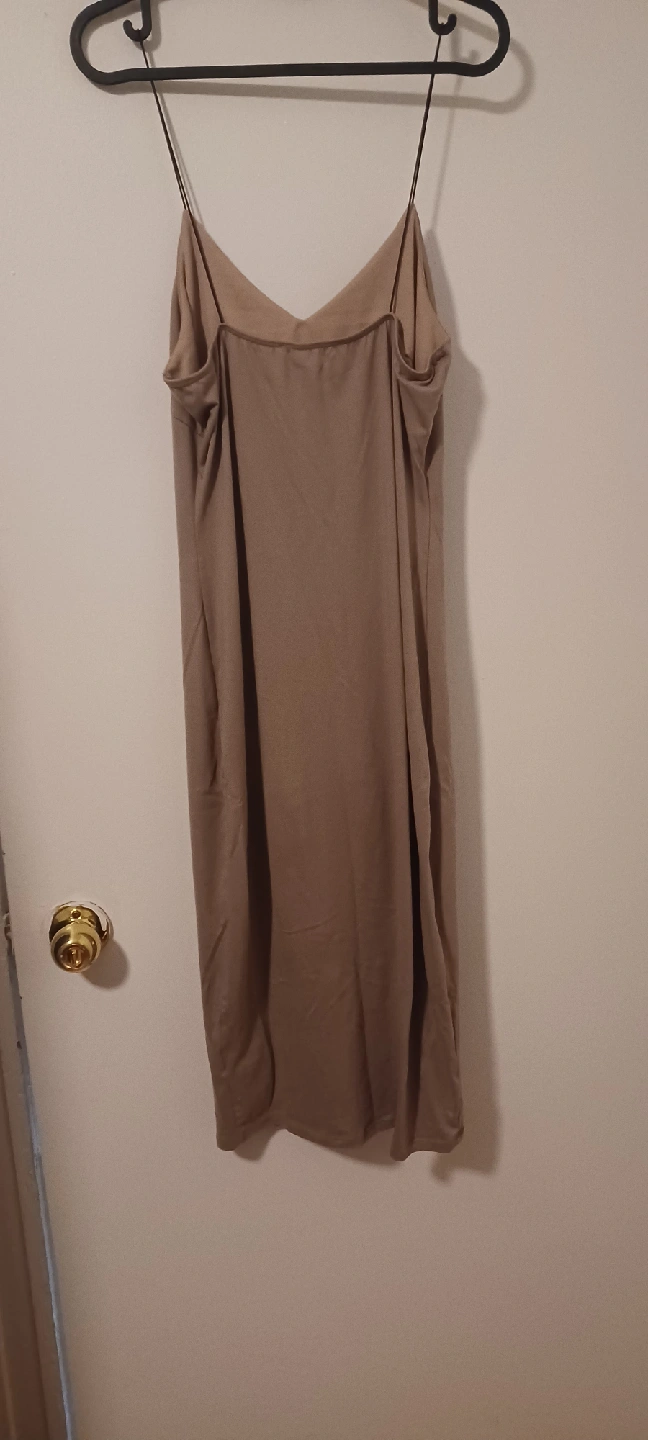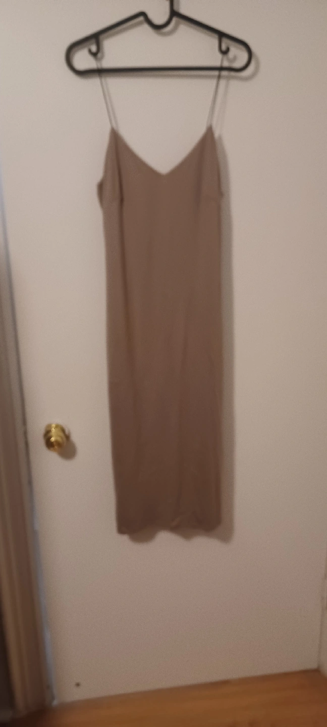 Selling a simple slip dress in a neutral beige colour. It's a versatile piece that can be dressed up or down. Perfect for layering or wearing on its own during fall weather.