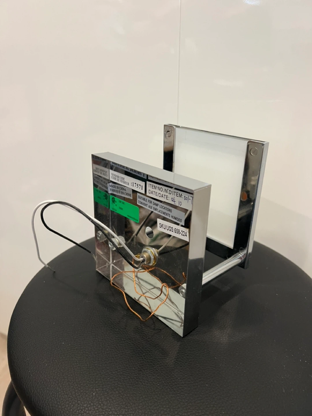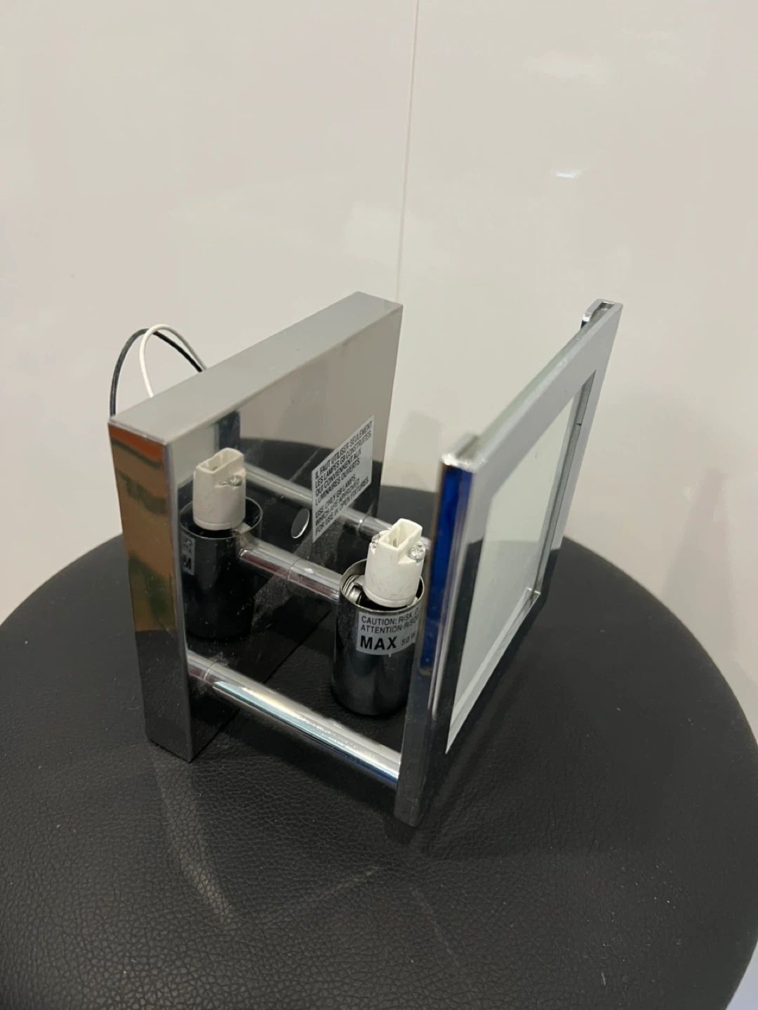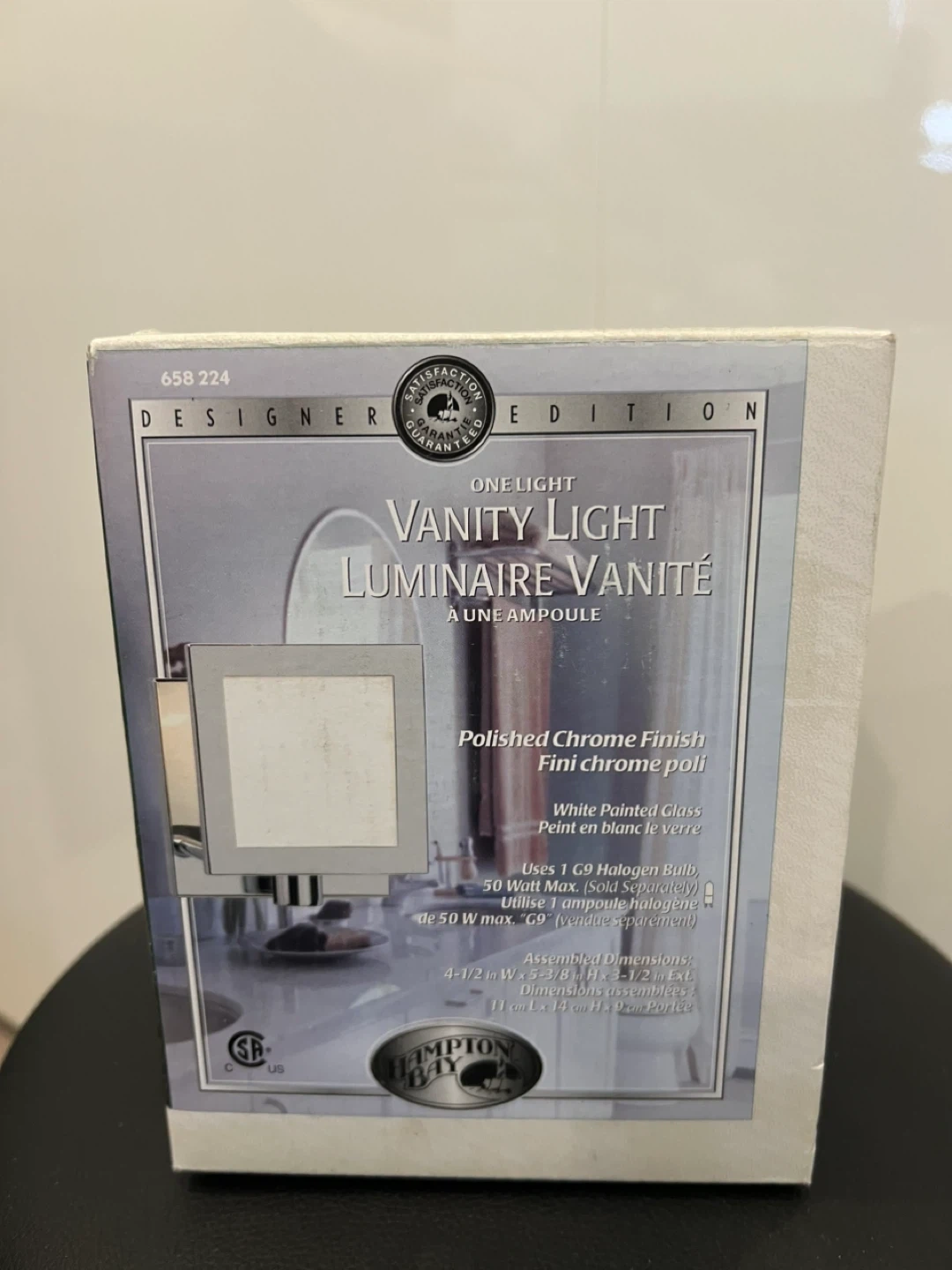 Selling 4 pieces of Hampton Bay vanity light in a polished chrome finish! It's designed for one G9 halogen bulb (sold separately). The white painted glass provides a clean look. Dimensions are approximately 4-1/2 in W x 4-1/2 in D x 4-3/4 in H.