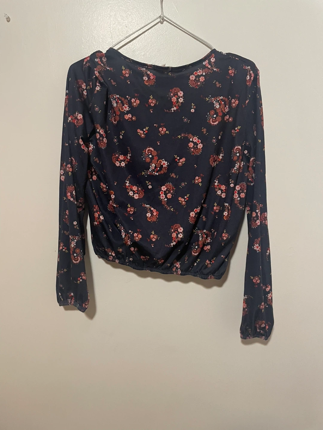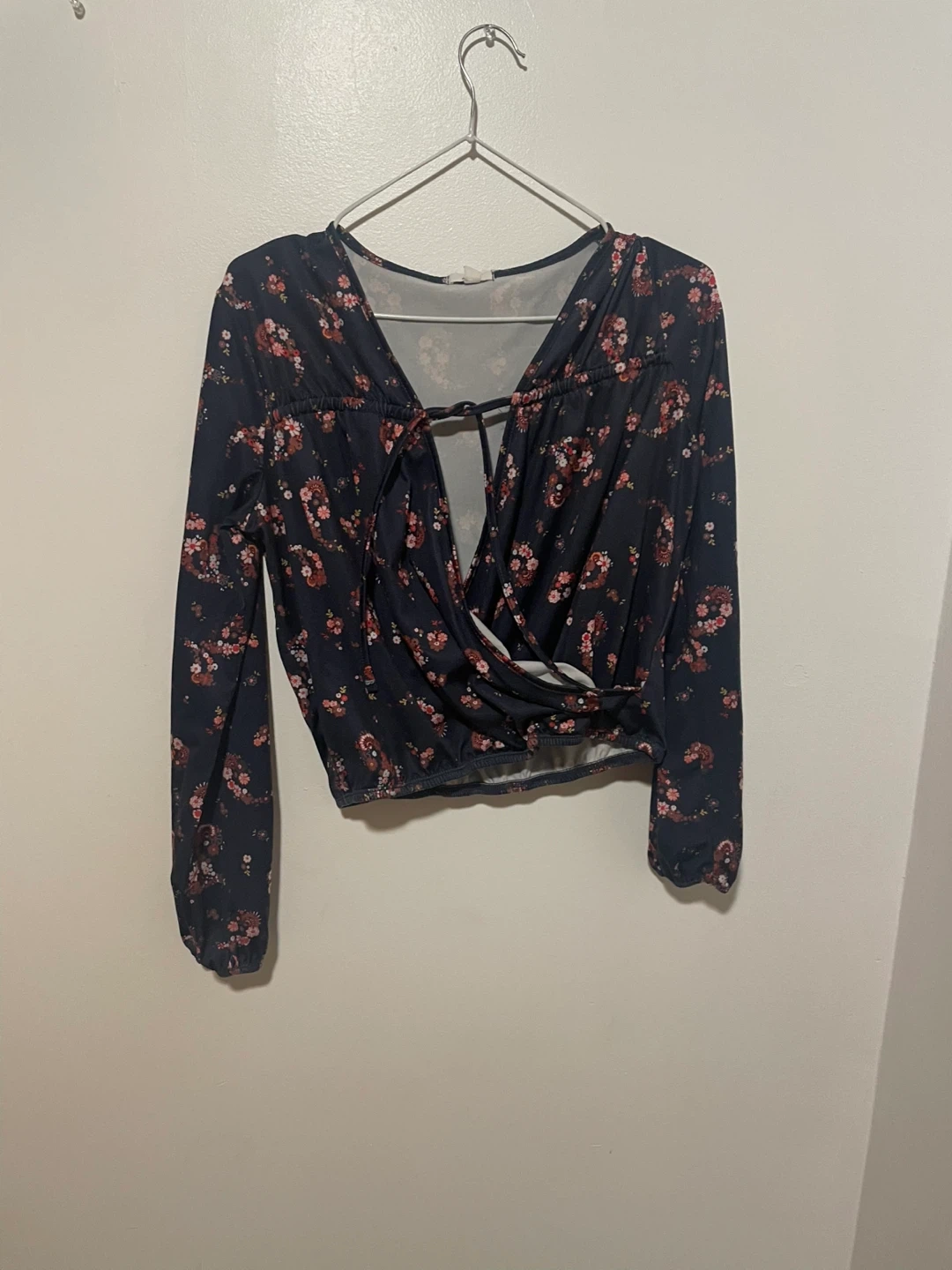 A cute floral long sleeve blouse! It has a flattering v-neck and a tie detail at the front. Perfect for layering or wearing on its own