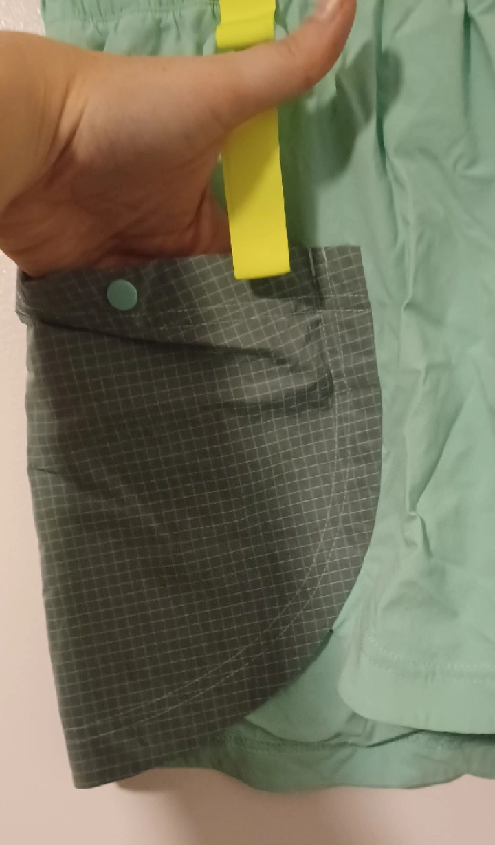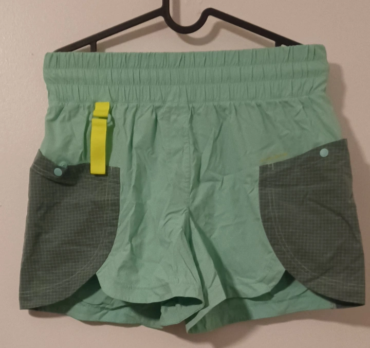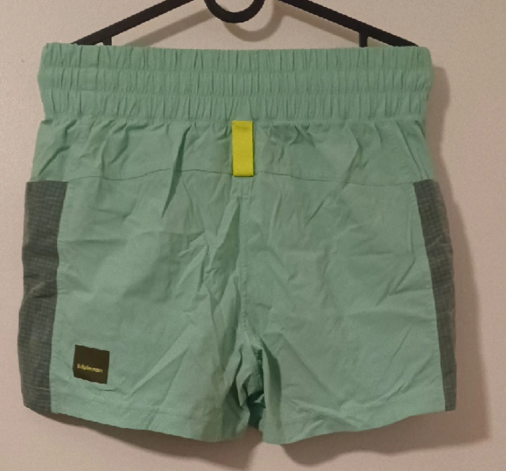 Selling a pair of Lululemon running shorts in a lovely mint green colour! They feature a comfortable elastic waistband and stylish grey checkered panels on the sides. There's also a handy yellow tab detail. Perfect for your next run or workout!