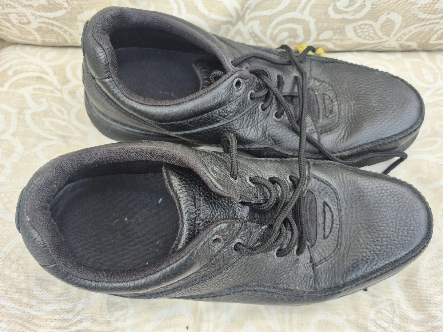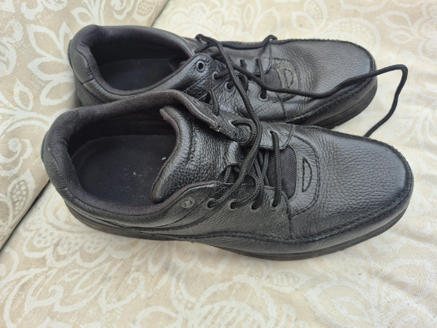 Selling a pair of men's black leather walking shoes. They show some signs of wear, but they are still in good condition for everyday use. Great for comfortable walking!