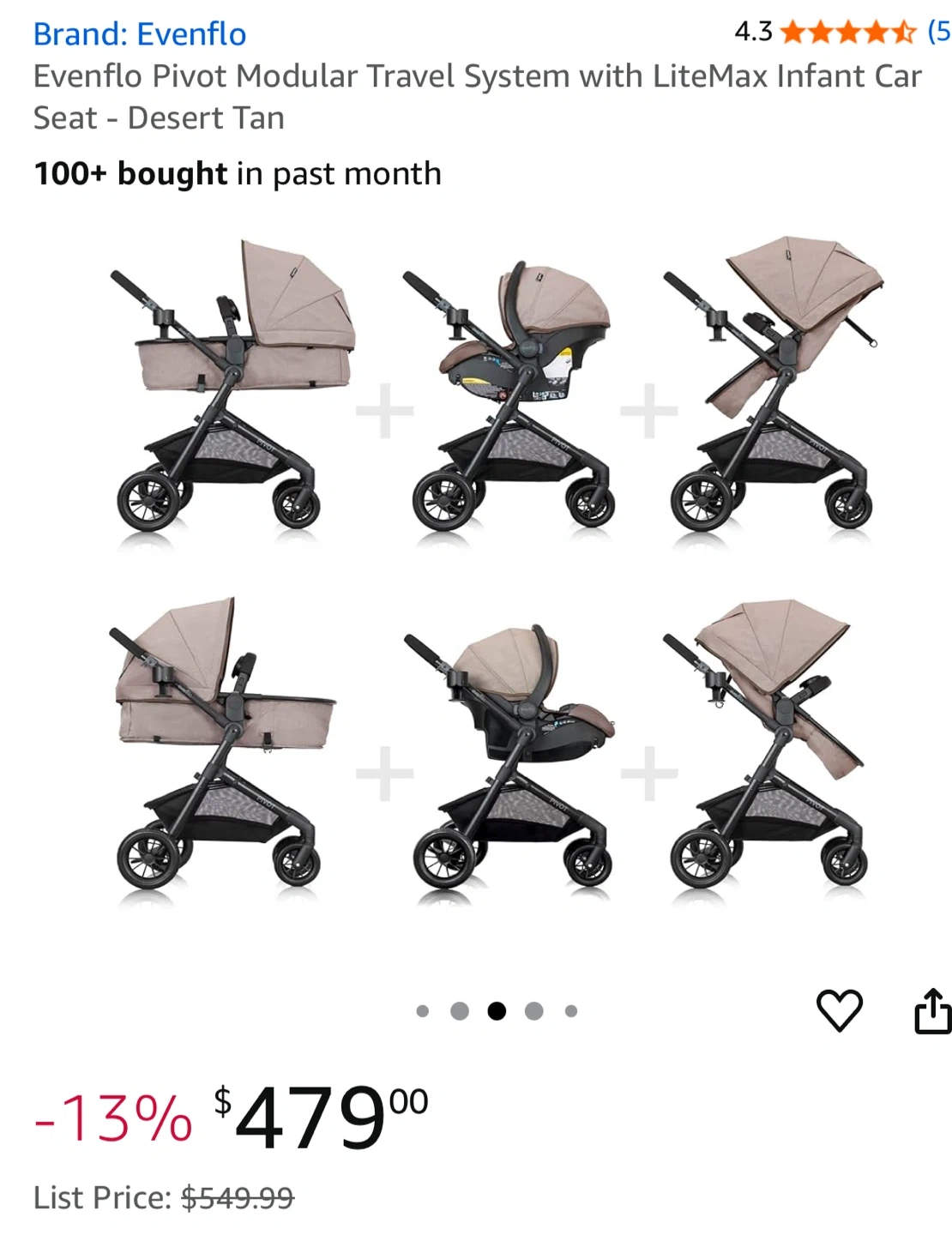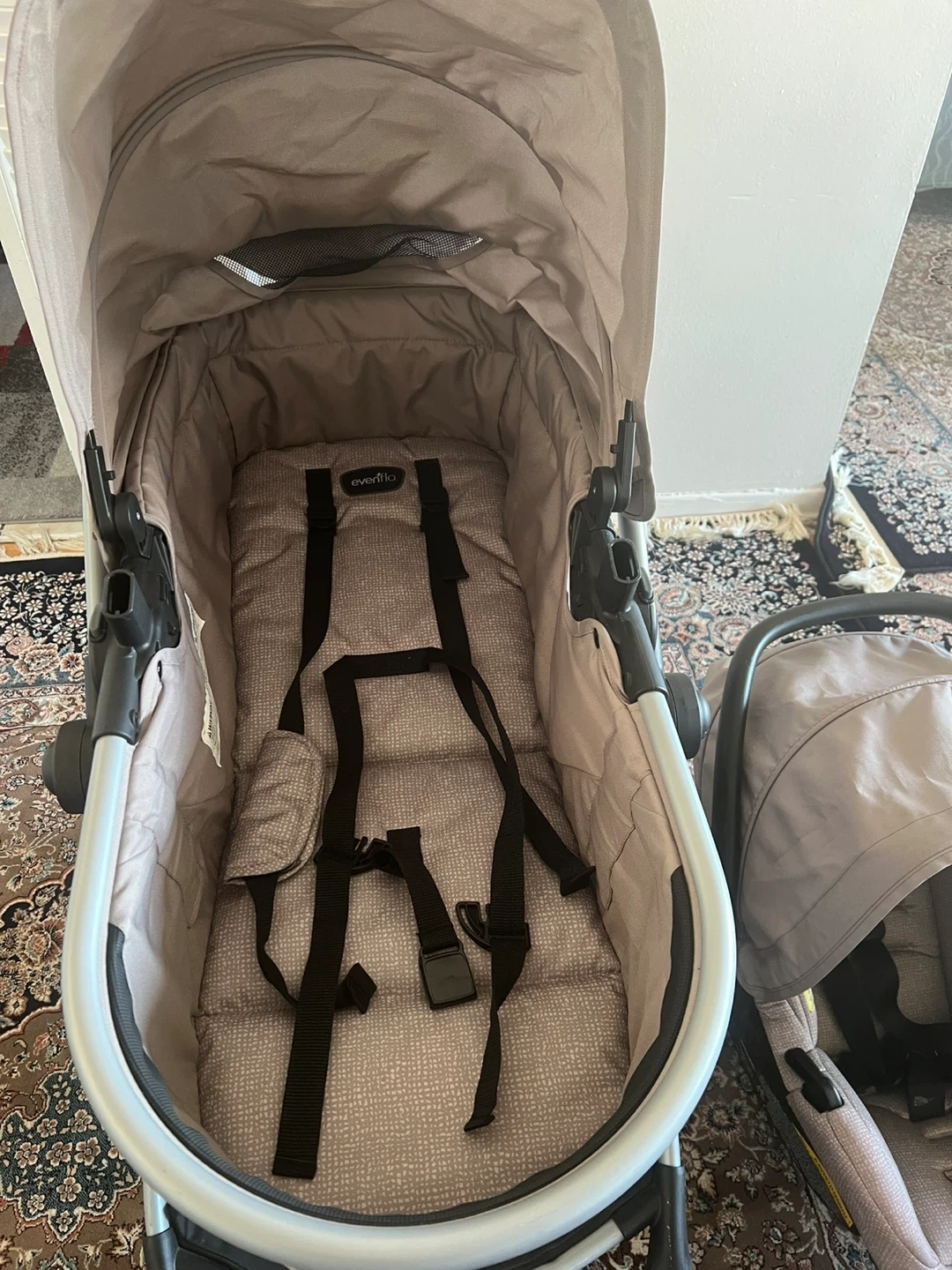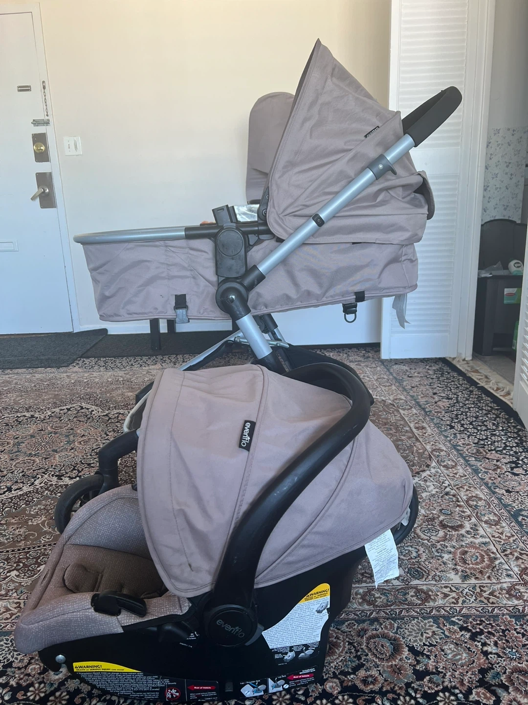 Selling an Evenflo Pivot Modular Travel System in Desert Tan. It's in great condition and ready for a new family! This travel system includes the LiteMax infant car seat and the modular stroller. Originally bought for $479.00 expiry date six years