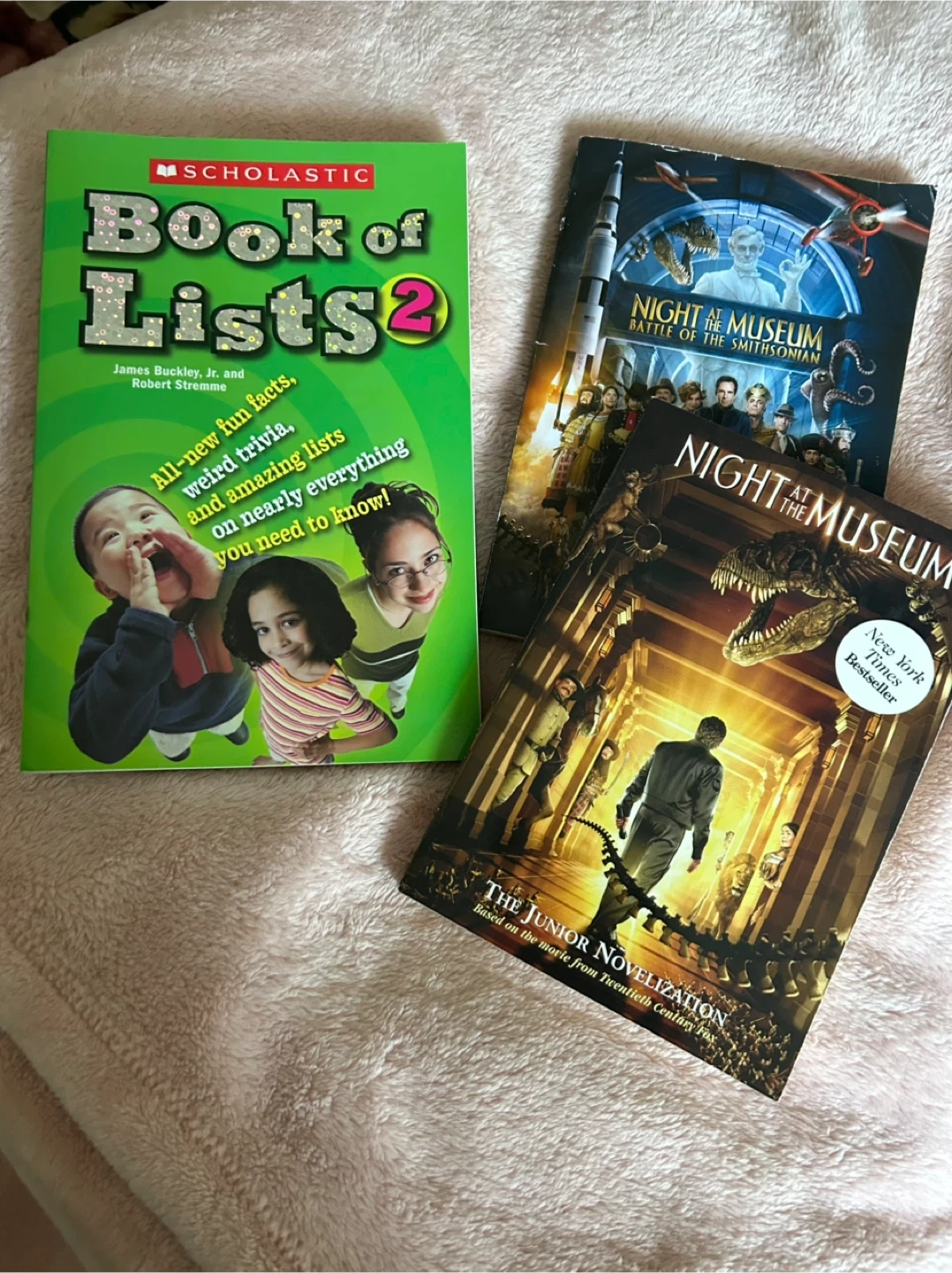 3 books: 1) junior novelization of Night at the Museum and 2) Night at the Museum: Battle of the Smithsonian by Leslie Goldman. Based on the movie from Twentieth Century Fox. A fun read for kids! Also adding a 3) Book of Lists to the bundle. Softcovers