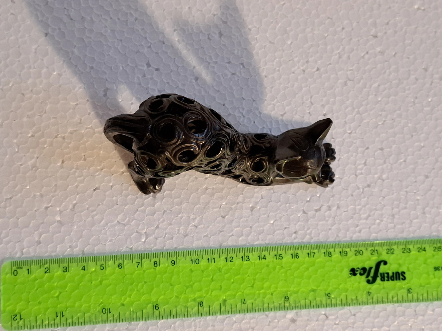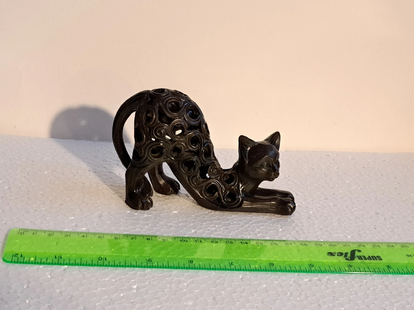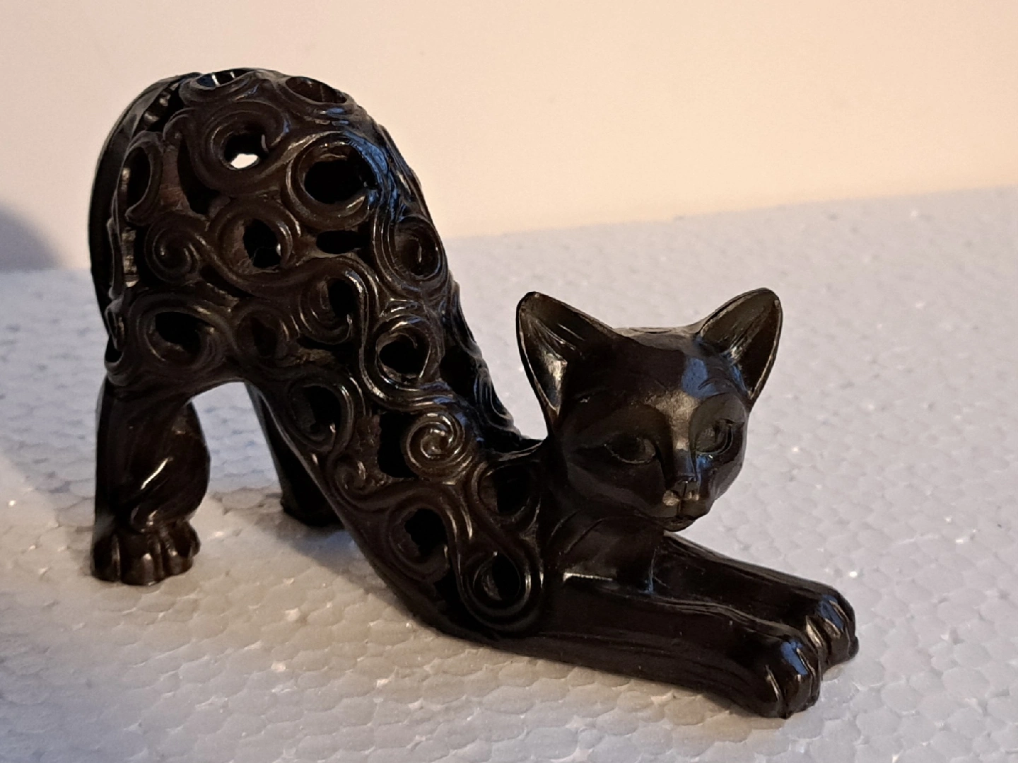 112Resin figure of a stretching cat with stylised hollow body. Dark brown in colour, about 8.5cm high at tallest point. Originally bought around 2004.
