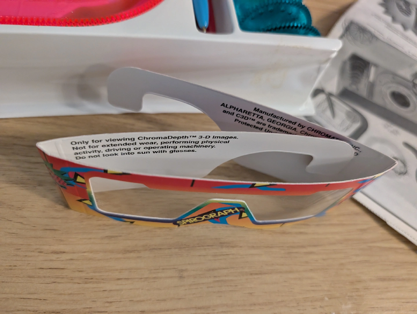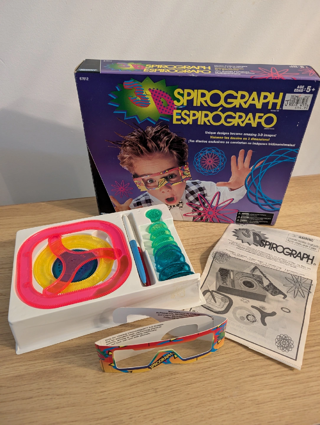 Get ready to create some amazing designs with this vintage Spirograph set! It includes 13 gears, 2 gear rings, 1 square ring, 1 propeller gear, 1 ring holder, 2 pens,. Also comes with ChromaDepth 3-D glasses and instructions. Box included!