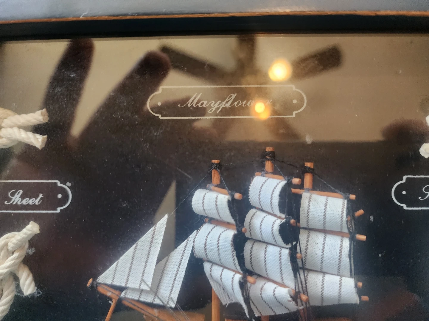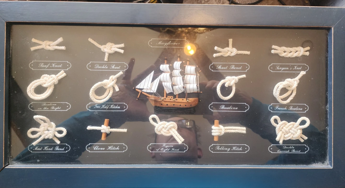 Selling a framed Mayflower nautical rope knot display. It features a variety of knots, each labeled for easy identification, surrounding a central ship model. A great piece for nautical enthusiasts or anyone looking to add a maritime touch to their decor