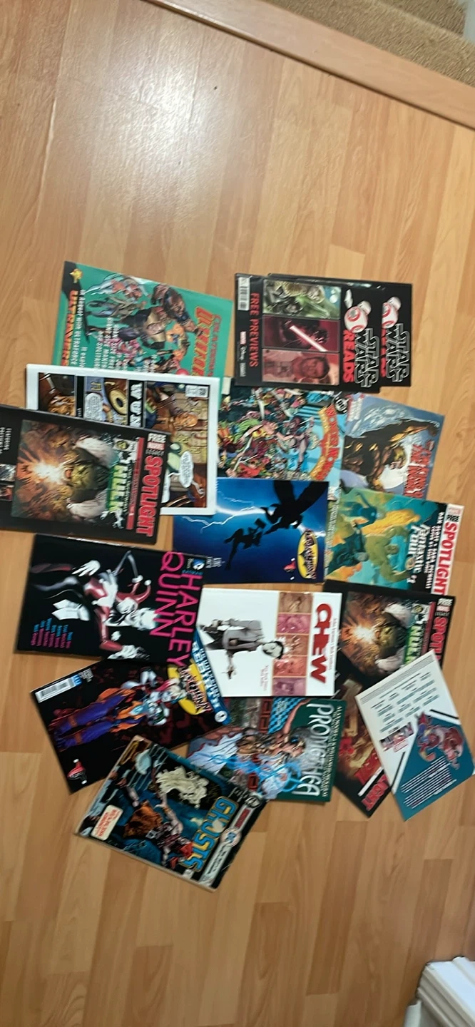 A collection of comic books featuring titles like Star Wars Reads, Ultraforce, Wun, Spotlight, Promethea, Ghosts, and Harley Quinn. Perfect for any comic book enthusiast!