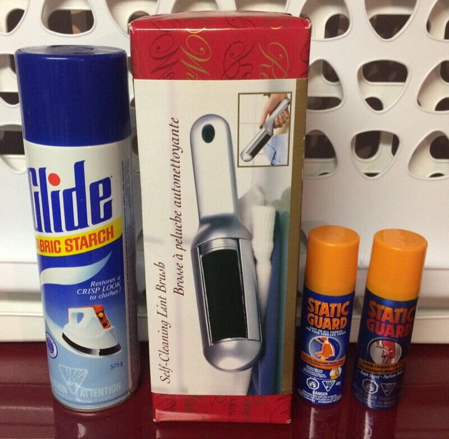 Laundry and clothing care supplies for sale. Most new. Self-cleaning lint brush new, sealed in gift wrap; can of spray starch may not have been used; and two travel-size cans of Static Guard clothing spray, never used. Great for removing lint and pet hair, keeping clothes crisp and wrinkle-free, reducing skirt clinginess and other static issues, and more. Handy for around the house or on business trips. All four items for $12. Near the Burlington/Oakville border.