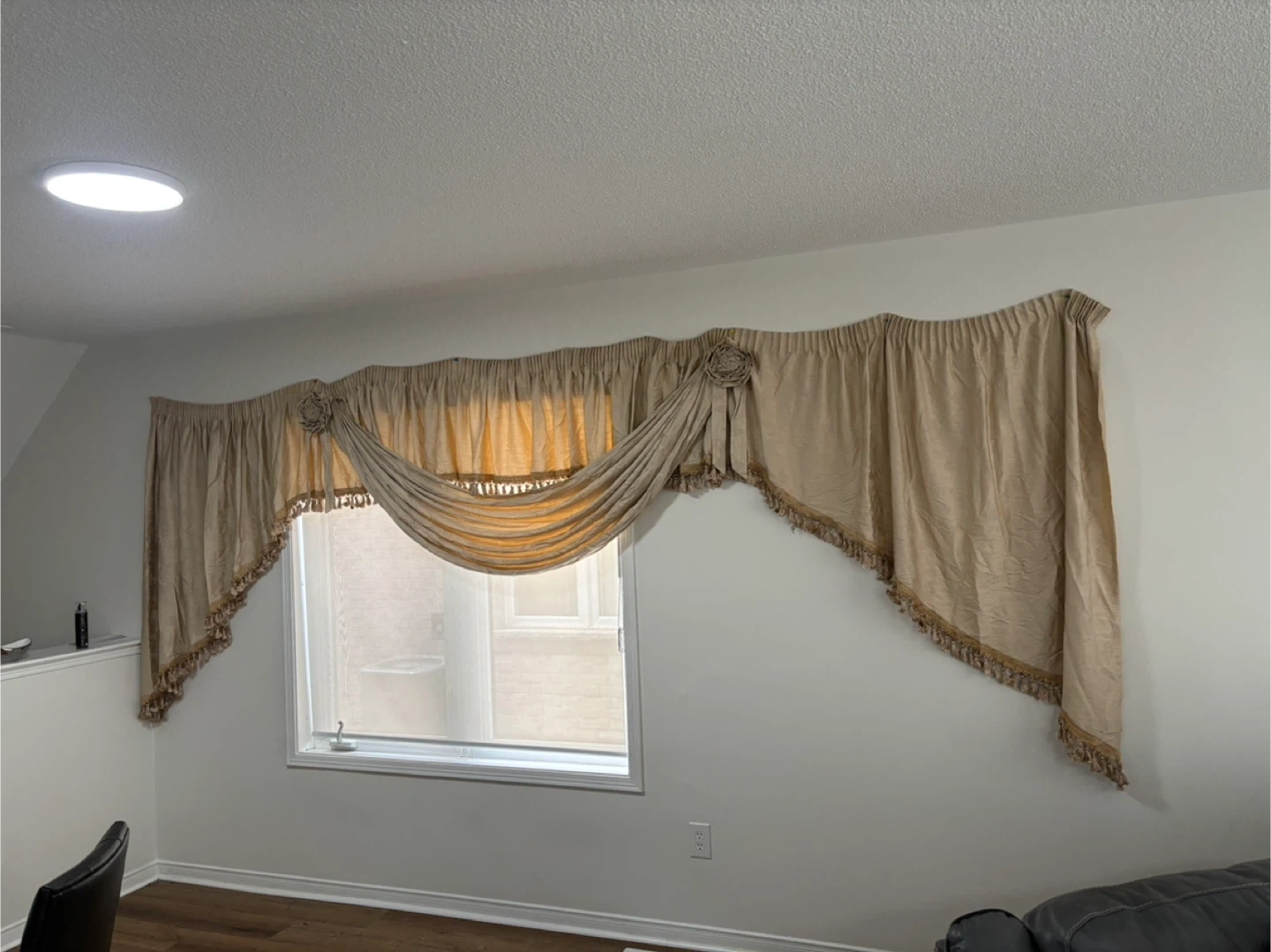Selling a beige window valance. It features a draped design with floral accents. Perfect for adding a touch of elegance to your living room or bedroom!