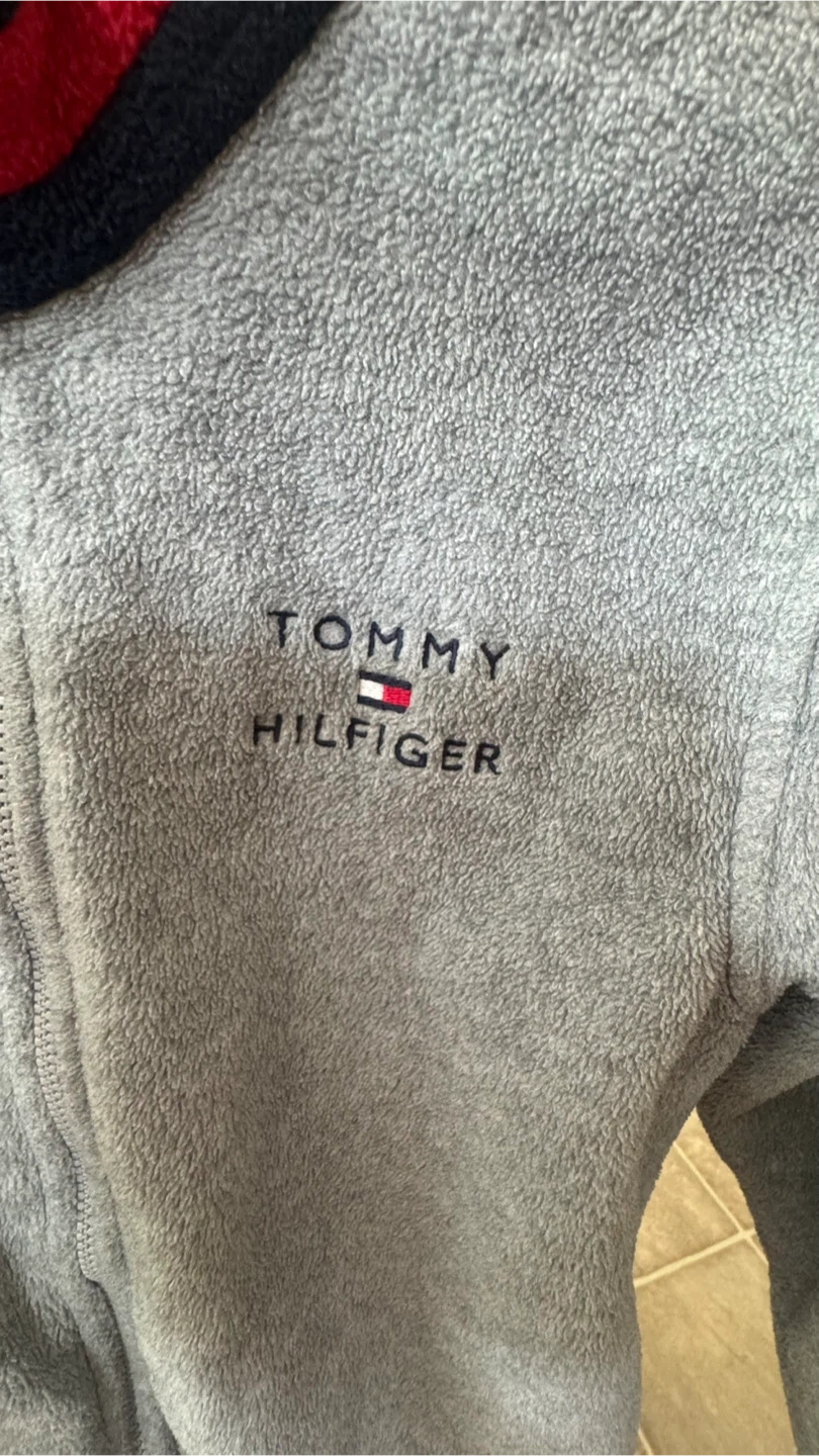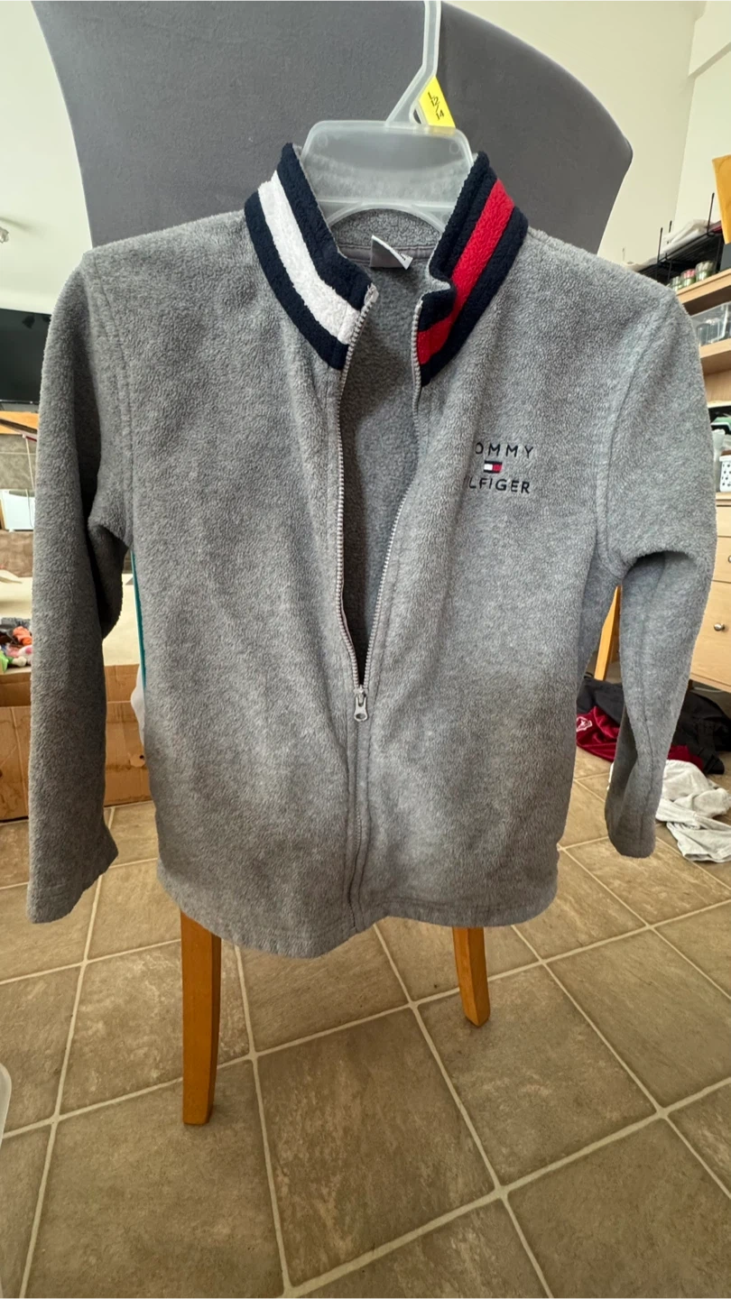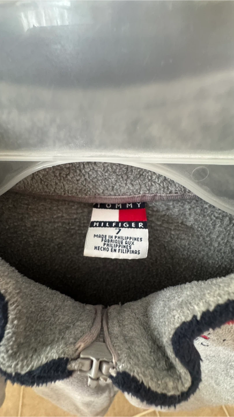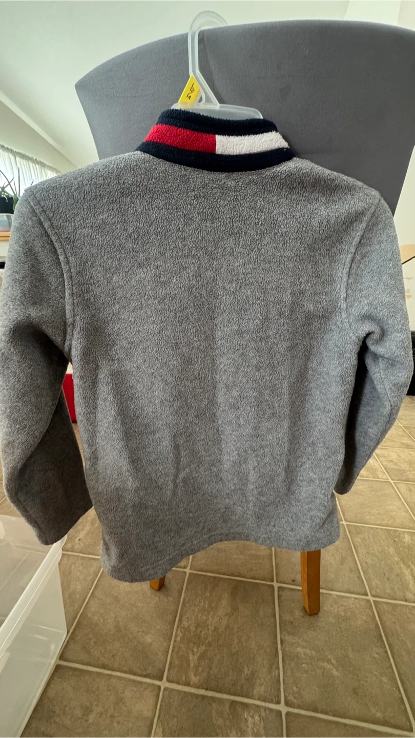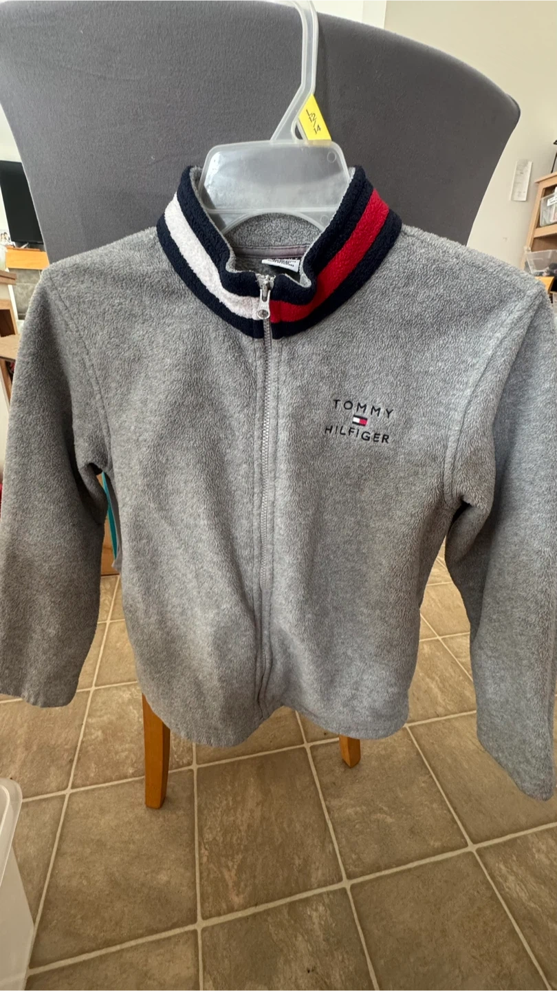 Cozy grey fleece jacket from Tommy Hilfiger! It's a size 7 and features the classic Tommy Hilfiger logo. Perfect for keeping your little one warm and stylish!