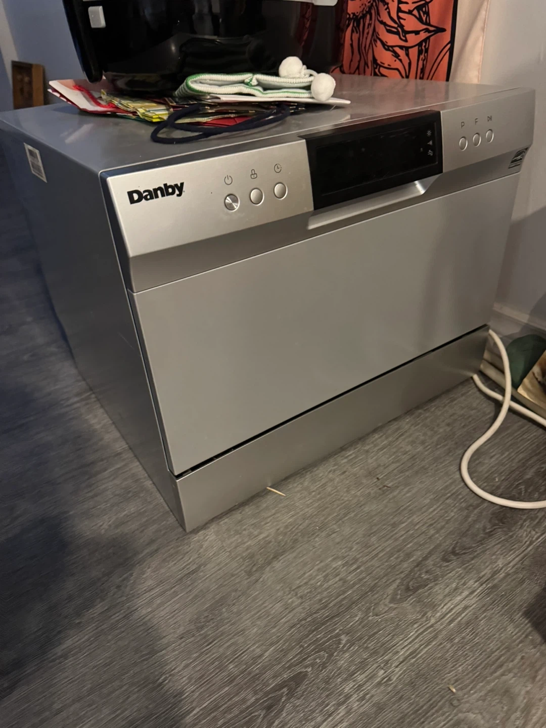 Selling a Danby countertop dishwasher in silver. It's in good condition and perfect for small spaces. Includes all the necessary hoses and connections.