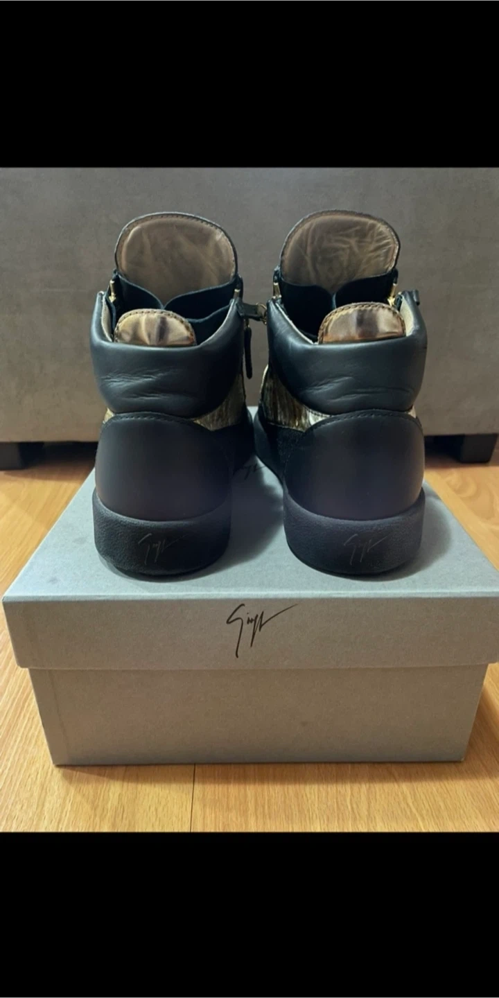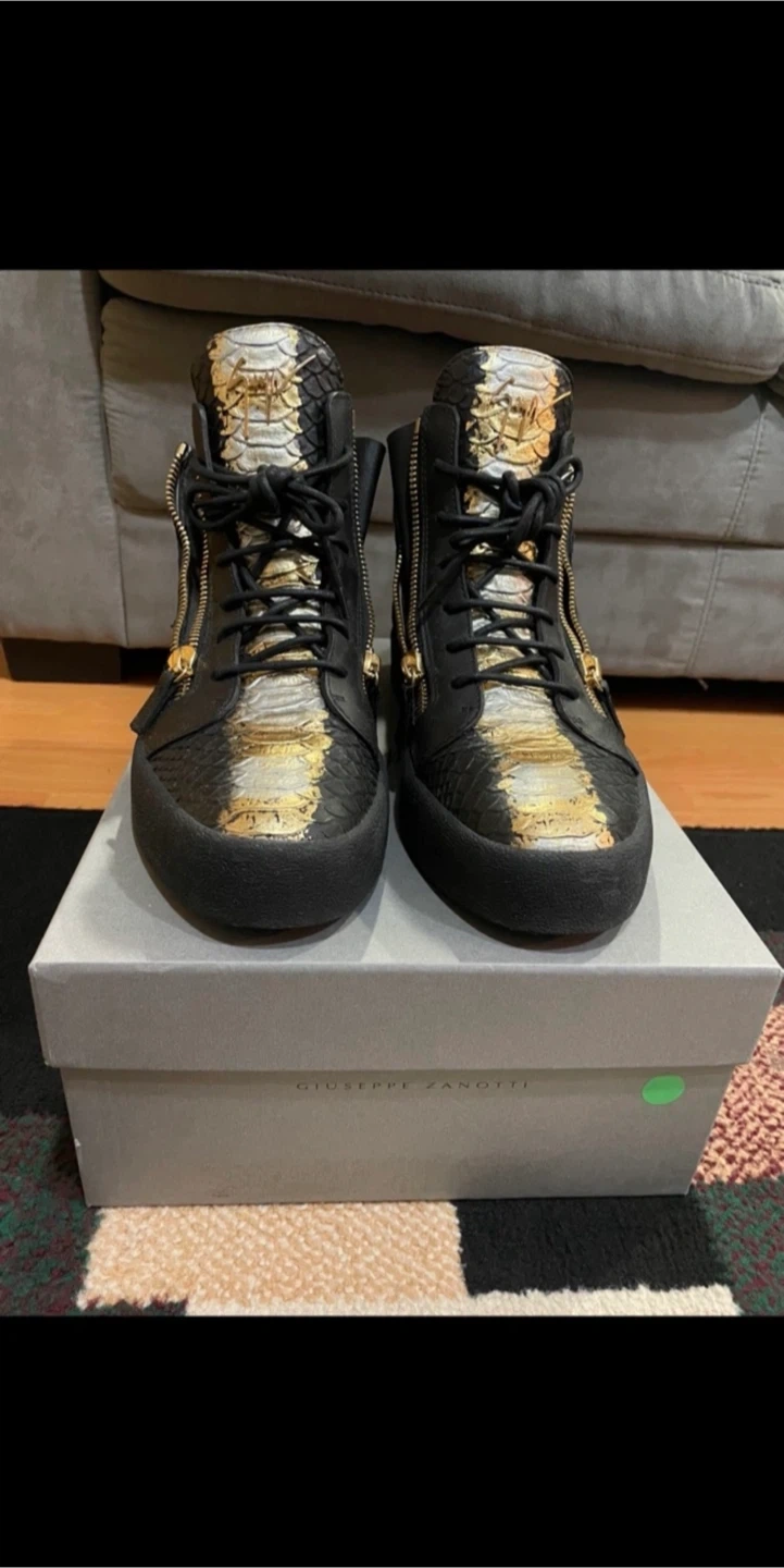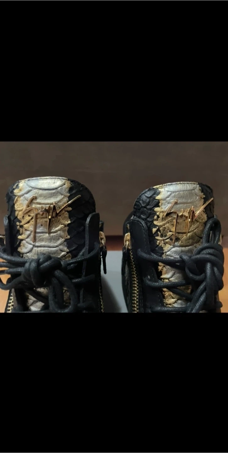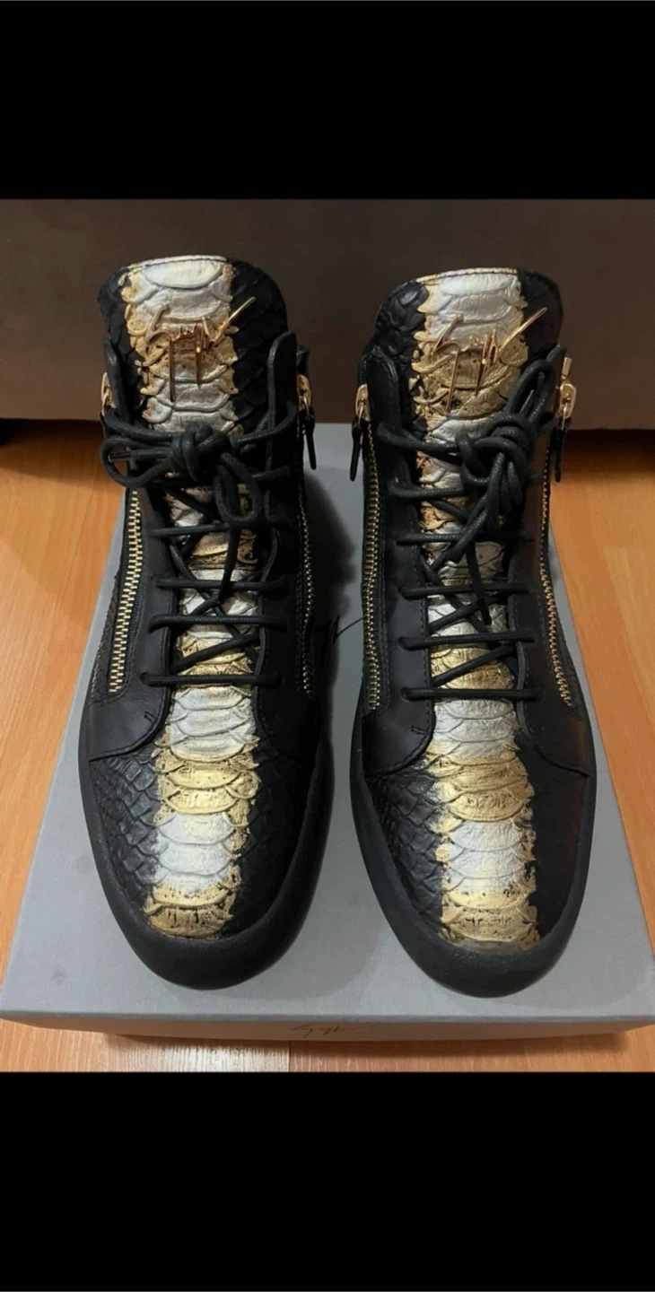 Giuseppe Zanotti high-top sneakers in black leather with gold and silver snake print accents. Features side zippers and lace-up closure. Includes original box and travel pouch.