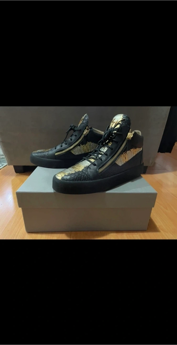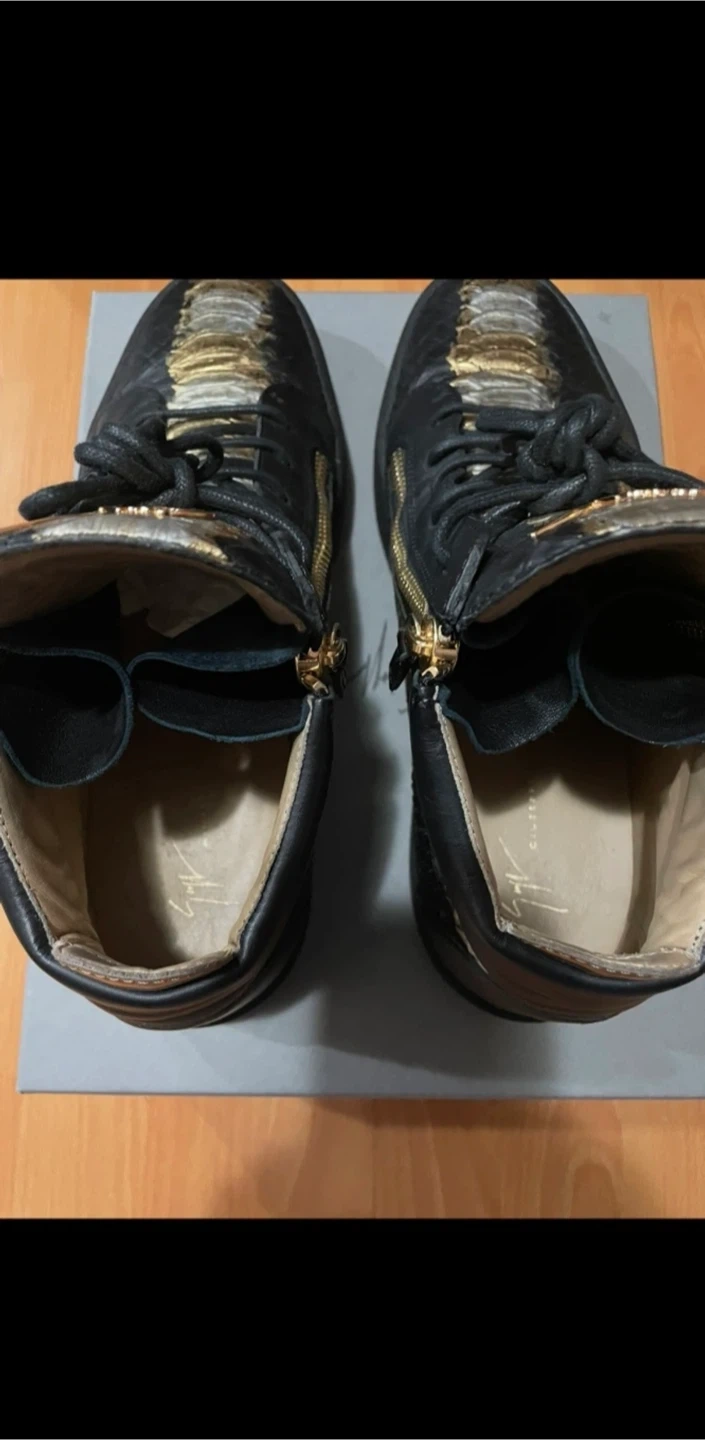 Giuseppe Zanotti high-top sneakers in black leather with gold and silver snake print accents. Features side zippers and lace-up closure. Includes original box and travel pouch.