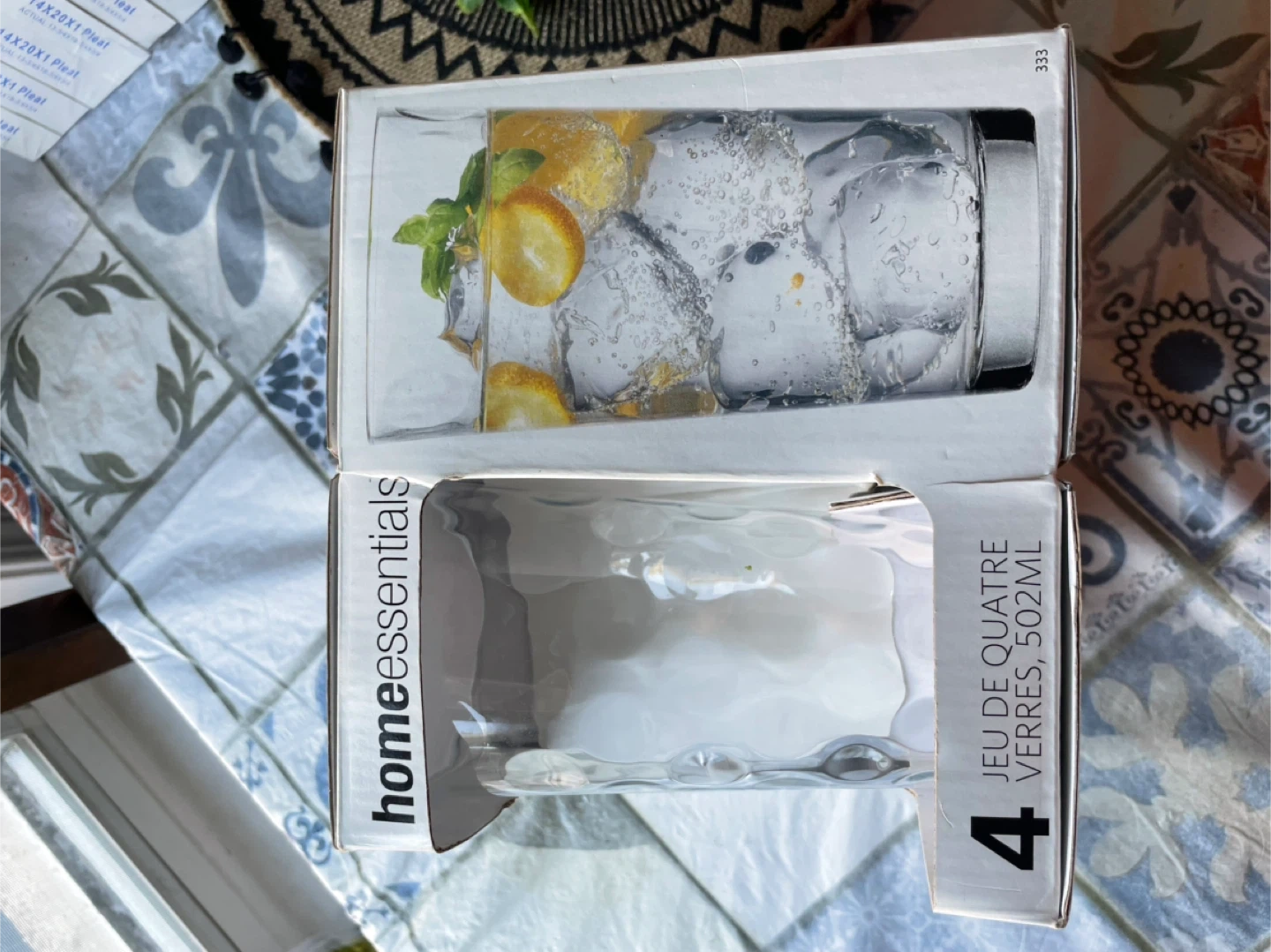 Selling a set of four Home Essentials glasses! They're 502mL each and come in their original box. Perfect for everyday use or entertaining