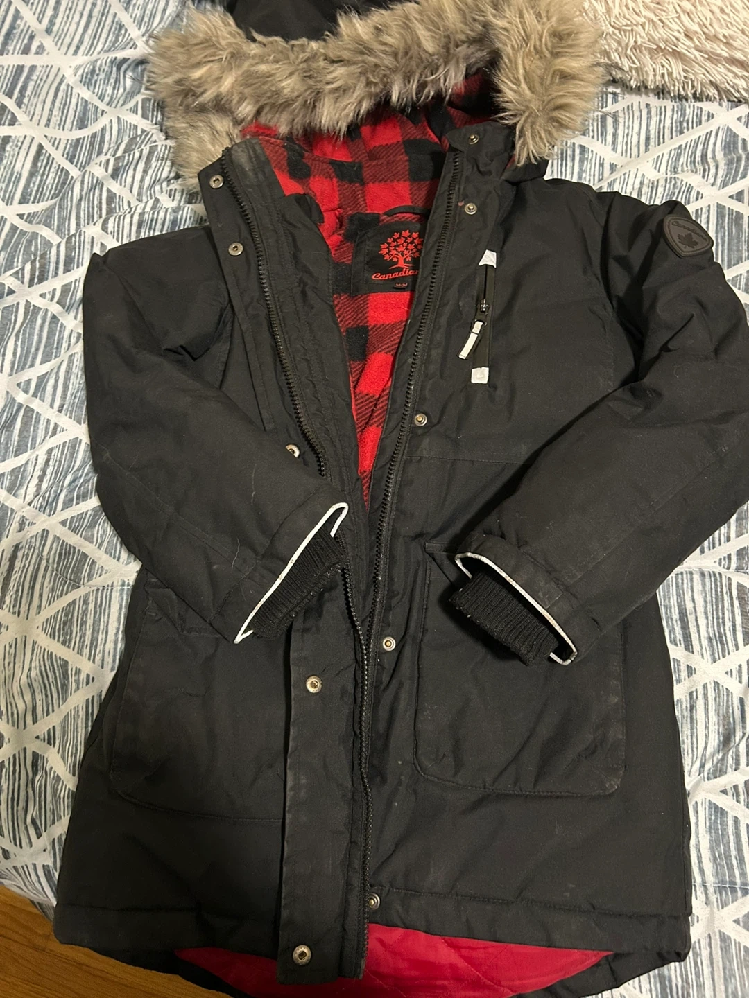 Stay warm this winter with this stylish black winter jacket from Canadiana! It features a cozy fur-trimmed hood and a red plaid lining. Perfect for braving the Canadian cold!