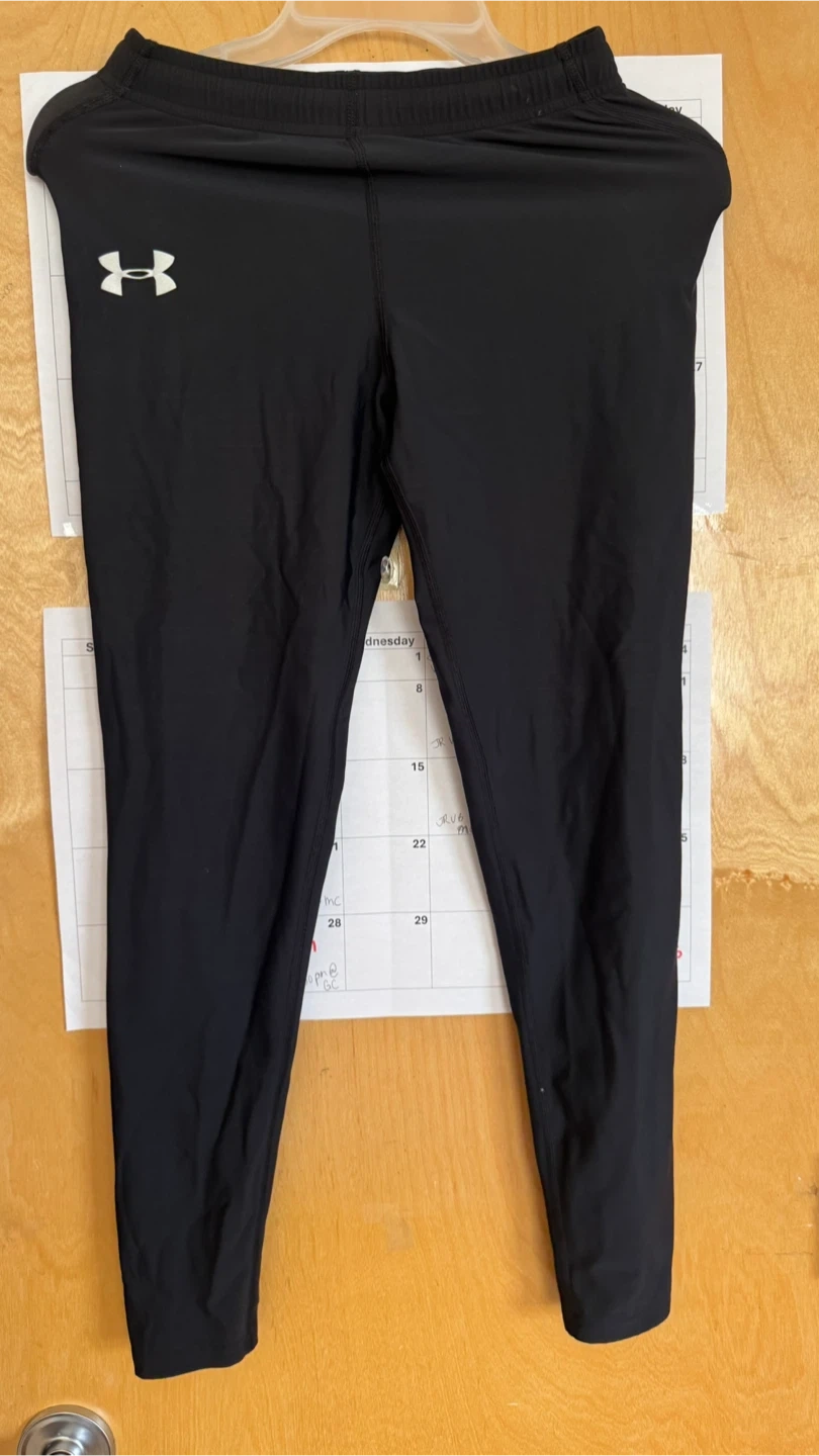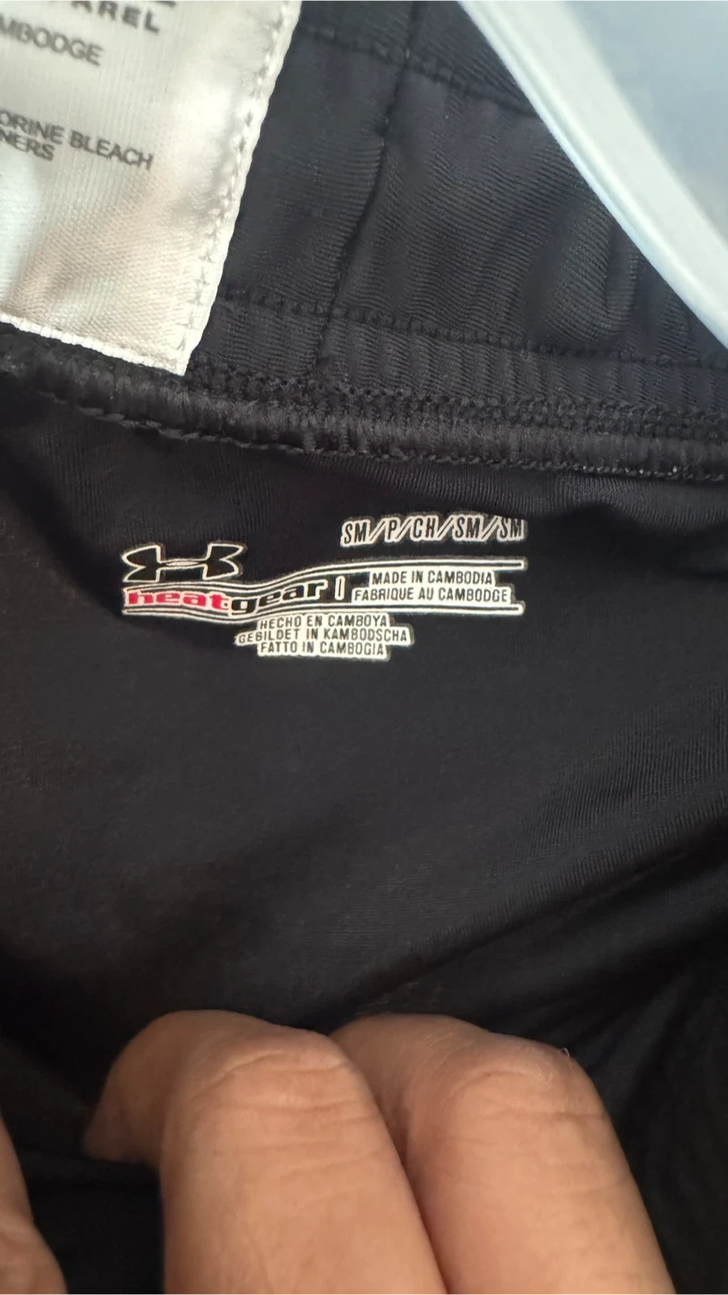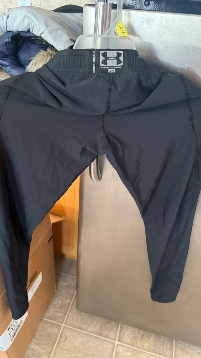 Selling a pair of Under Armour leggings in black. They are a size small and made from a blend of 80% nylon and 20% elastane. Great for workouts or everyday wear!