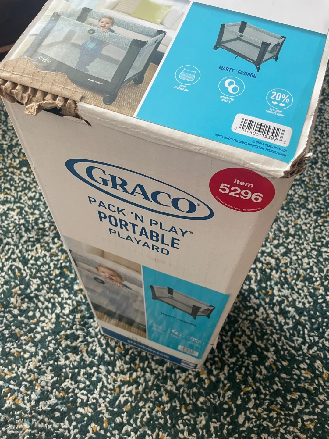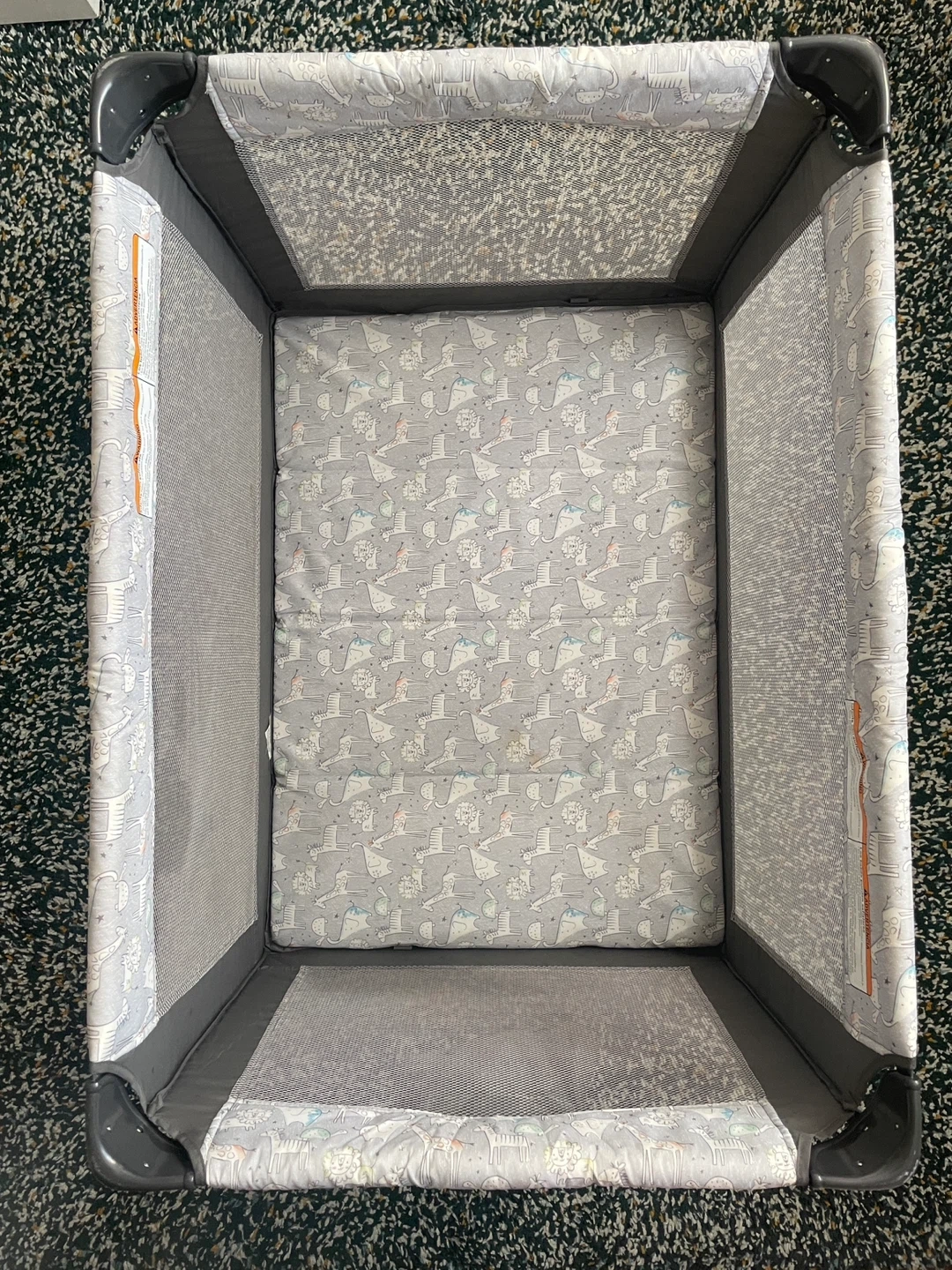 Good condition (small stain on bottom panel, see photos). Otherwise it is as it was when we purchased. It’s always been a bit tricky to get the sides to stick but once it is set up it is solid. Mesh bag on side of crib for storage. Very good size/weight for travel. Approximate measurements: